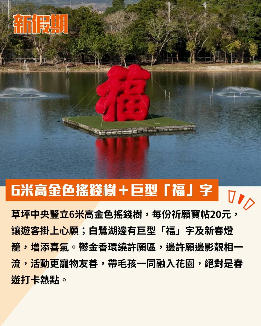 草坪中央豎立6米高金色搖錢樹,每份祈願寶帖20元,讓遊客掛上心願;白鷺湖邊有巨型「福」字及新春燈籠,增添喜氣。鬱金香環繞許願區,邊許願邊影靚相一流,活動更寵物友善,帶毛孩一同融入花園,絕對是春遊打卡熱點。