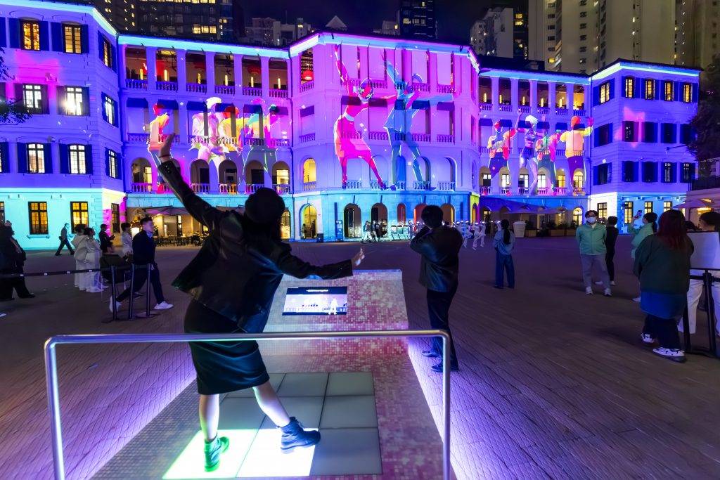 在澳洲創意及技術夥伴 The Electric Canvas ⼀如既往的⽀持下,今年「綻放⼤館」與 The Collective合作,主創團隊擅於運⽤最新科技開拓藝術的可能性,更⾸次引入實時互動體驗。觀眾可於檢閱廣場踏上感應式舞磚,以不同動作與律動觸發立體光雕投影的視覺變化。裝置可追蹤觀眾的⾝體動作,實時投影到營房⼤樓外牆上,讓觀眾化⾝光雕投影匯演的參與者,在⼤型舞蹈派對共同起舞。