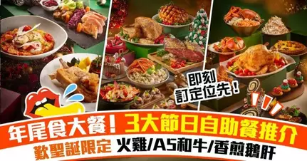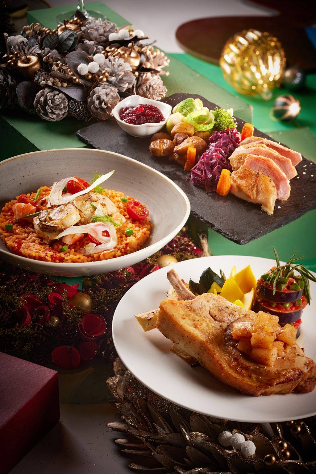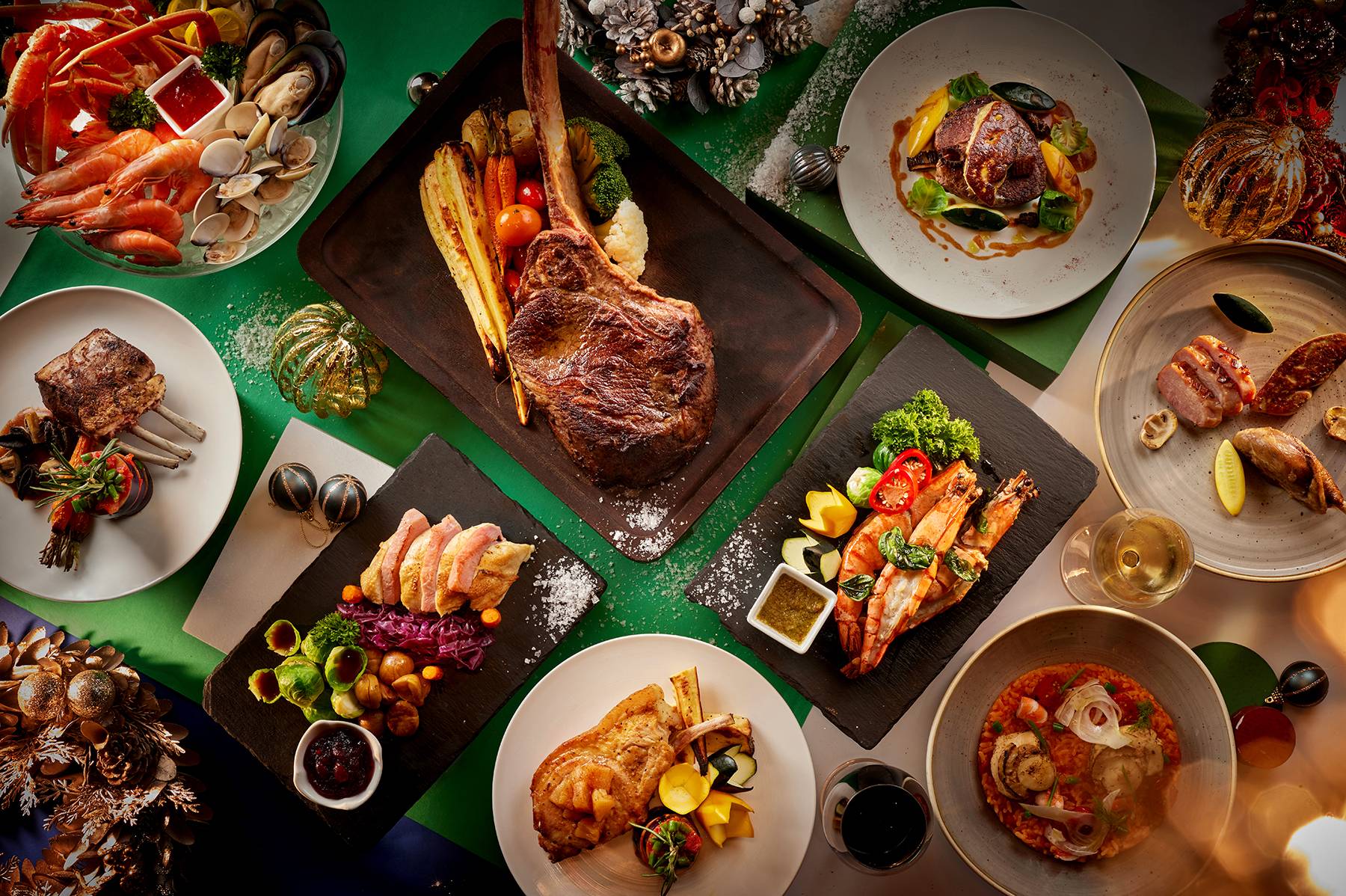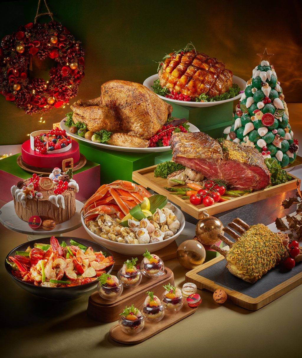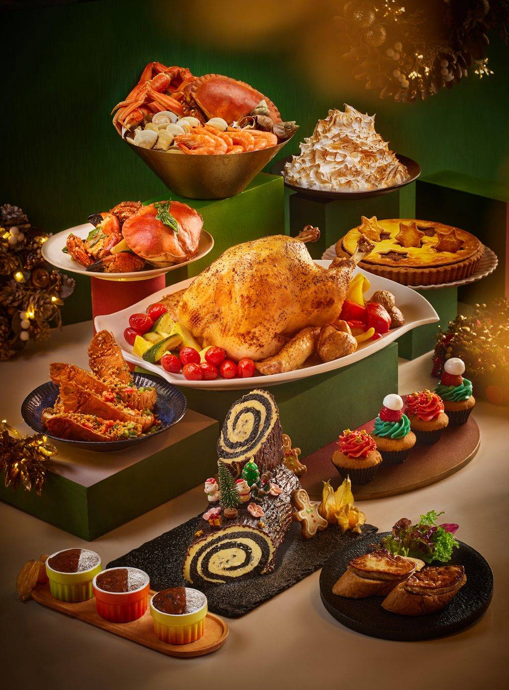 午餐時段可以品嚐到冰鎮海鮮、香烤火雞、燒澳洲草飼肉眼配黑松露燒汁及慢燒香草羊鞍等;晚餐時段則特別加入香煎鴨肝多士、避風塘琵琶蝦等惹味菜式,選擇更多更豐富。而甜品區亦充滿驚喜,包括:可愛嘅樹幹蛋糕、聖誕果餡金寶批,喺指定時段更有經典火焰雪山,打卡就啱晒啦!