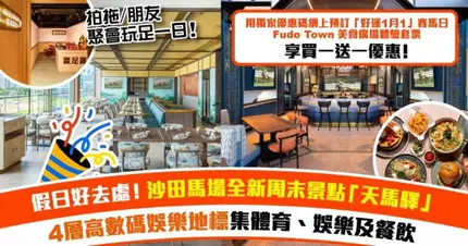 憑以下優惠碼 YQ7XJYHD於網上預訂「好運1月1」賽馬日 Fudo Town 美食廣場HK$200體驗套票(主要賽事價),即可享買一送一優惠!限量名額:100 名,送完即止。