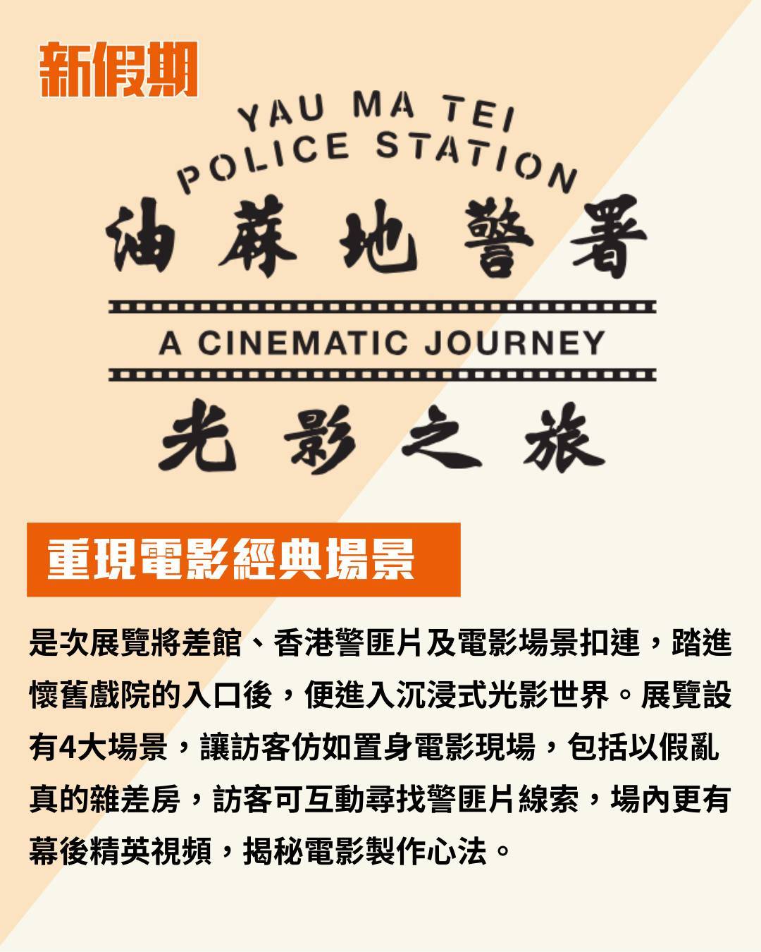舊油麻地警署化身光影之旅,香港經典警匪片場景重現!位於油麻地廣東道627號的二級歷史建築,首度活化地面樓層,由本地電影工作者打造沉浸式展覽,讓你走進懷舊戲院門口,置身槍林彈雨的警匪江湖,重溫英雄與梟雄的星光歲月。