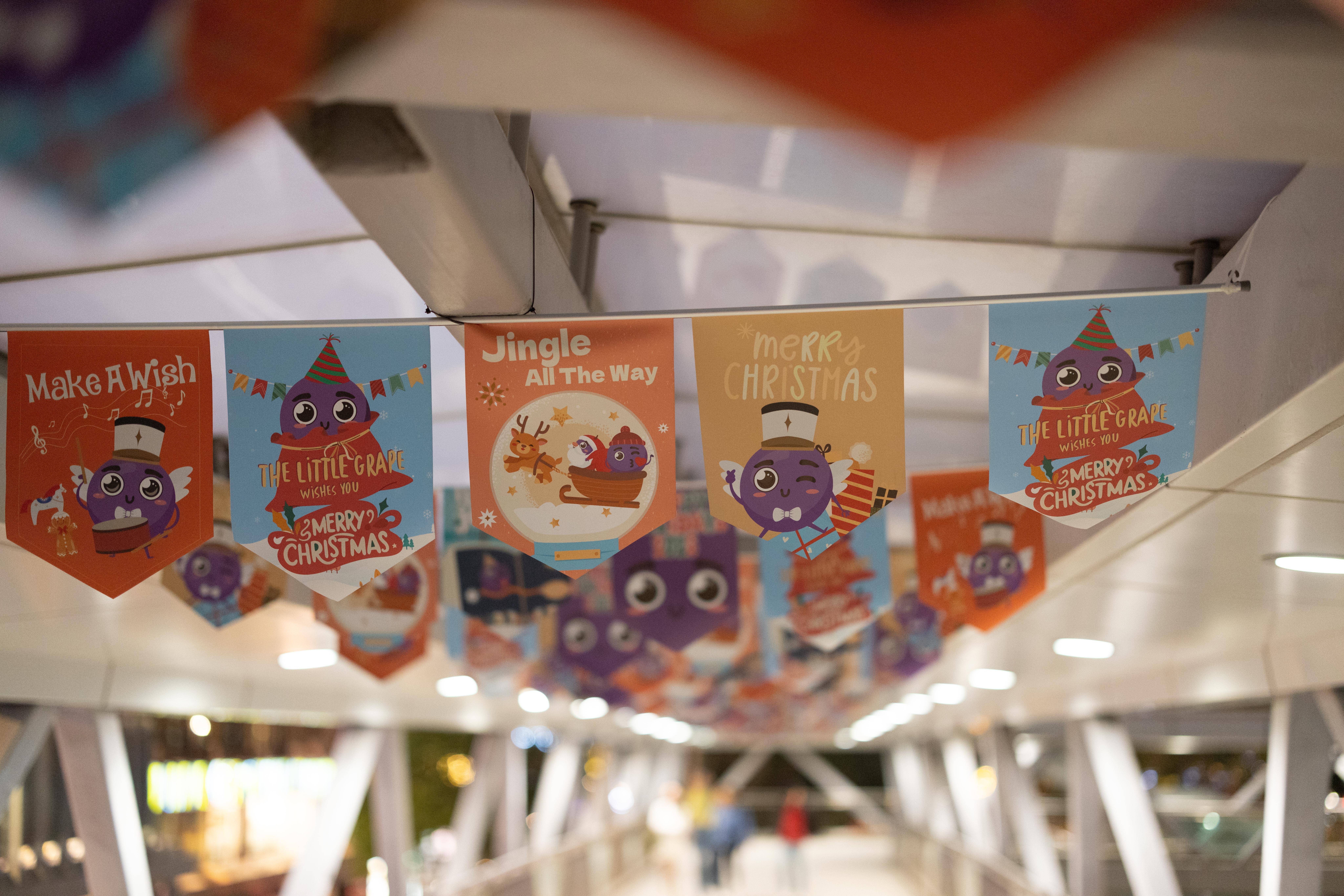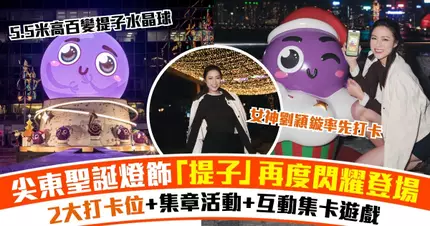 今年位於尖沙咀中心及帝國中心的巨型LED幕牆,會繼續播放去年廣受好評的聖誕主題「提子」動畫;麼地道行人天橋亦已換上全新的「提子」主題燈飾與吊旗裝飾,保留大眾在尖東欣賞燈飾的集體回憶!