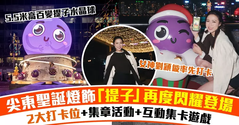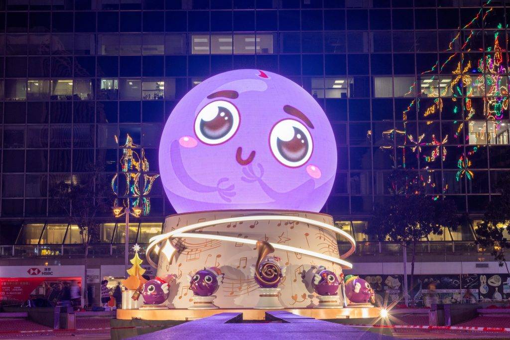今年尖東燈飾最大亮點,絕對是5.5米高巨型LED球體「百變提子水晶球」!這個巨型水晶球設於百週年紀念花園噴水池上方,循環播放「提子」10種可愛表情及聖誕水晶球動畫,動感十足,勢必成為尖東夜景中最矚目的打卡位。