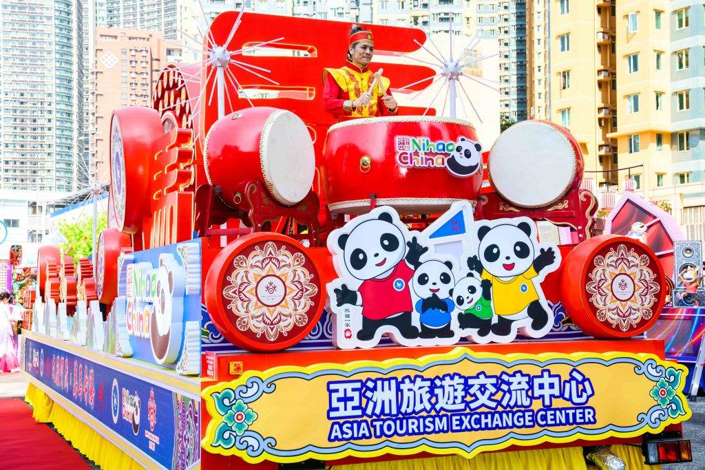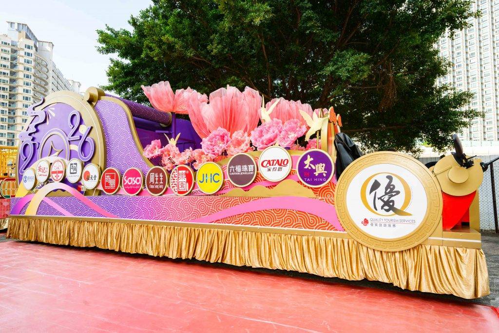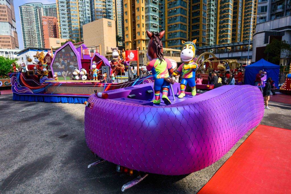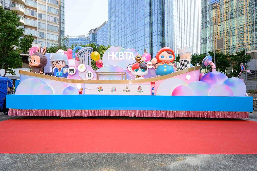 香港旅遊發展局今年好事成雙,有兩輛花車登場!主車以中式帆船領航,巨型LED船帆播放香港各項盛事焦點片段,寄語香港昂首啟航。花車上每隻百變馬仔吉祥物象徵香港多元豐富的各項藝文活動、體育盛事同節日慶典,包括賽馬、香港美酒佳餚巡禮、舞火龍等等;仲有迷你版啟德體育園主場館打頭陣,寓意新地標將引領香港盛事邁向新高度,與環球旅客同歡!