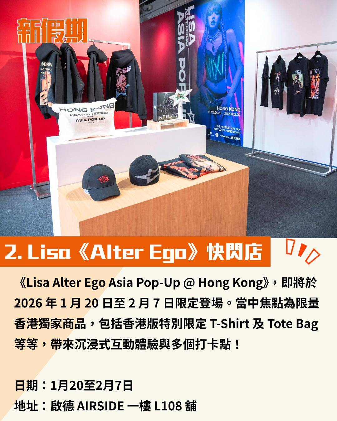 《Lisa Alter Ego Asia Pop-Up @ Hong Kong》,即將於 2026 年 1 月 20 日至 2 月 7 日限定登場。當中焦點為限量香港獨家商品,包括香港版特別限定 T-Shirt 及 Tote Bag 等等,帶來沉浸式互動體驗與多個打卡點!