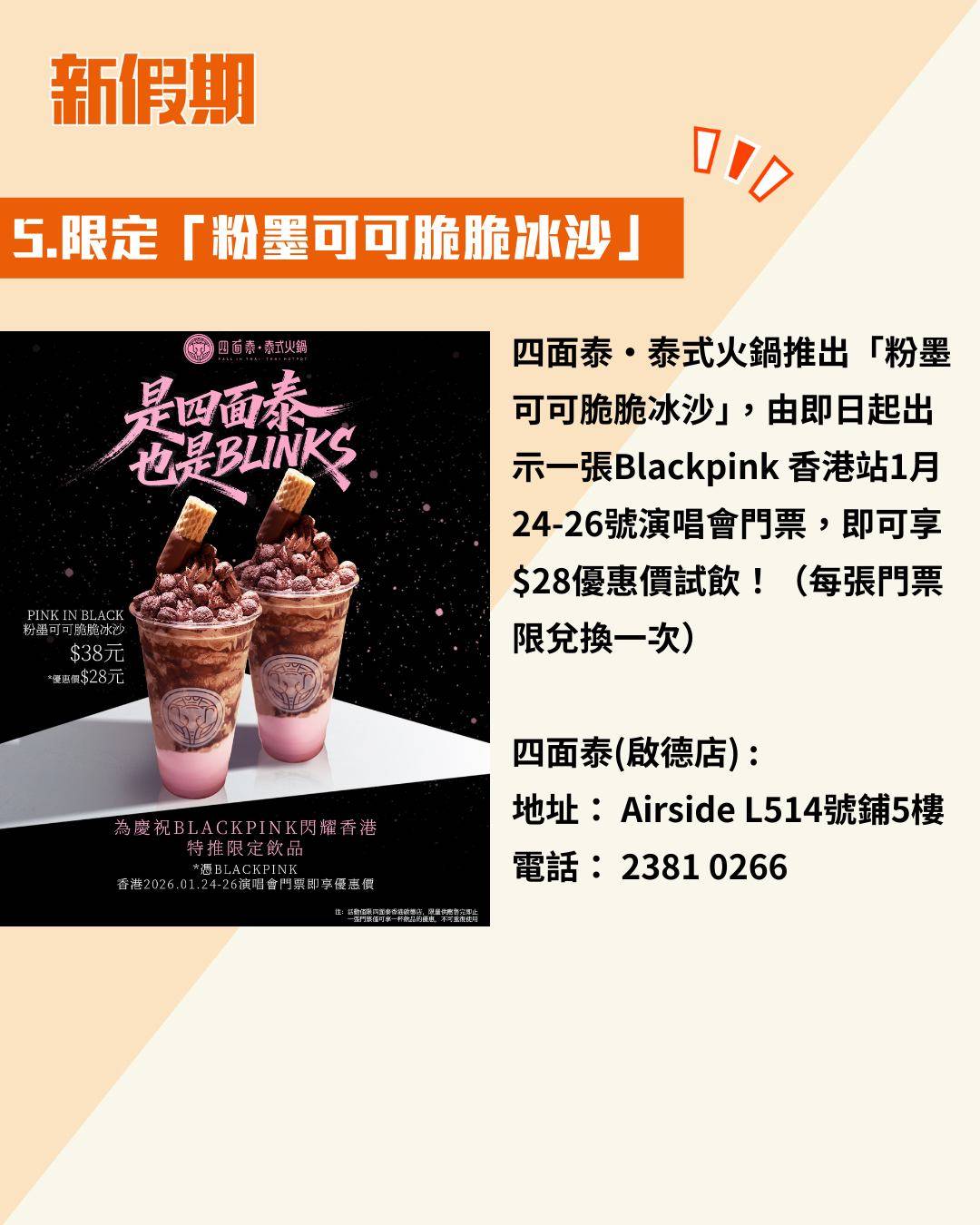 四面泰·泰式火鍋推出「粉墨可可脆脆冰沙」,由即日起出示一張Blackpink 香港站1月24-26號演唱會門票,即可享$28優惠價試飲!(每張門票限兌換一次)
