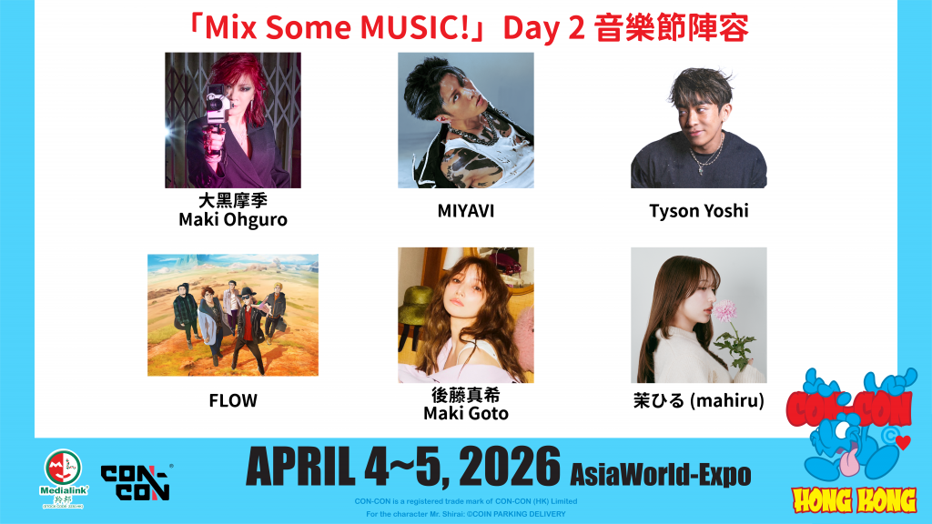 「Mix Some MUSIC!」音樂節將匯聚多位殿堂級及人氣歌手、樂隊及表演者,將一連兩日為大家熱血高歌!包括《新世紀福音戰士》主題曲〈殘酷天使的行動綱領〉主唱歌手高橋洋子,暌違7年後再度來港、曾演唱動畫《男兒當入樽》歌曲〈我只凝望你〉的女歌手大黑摩季、曾參與內地綜藝節目《披荊斬棘的哥哥》的視覺系搖滾歌手MIYAVI、女團「Morning娘」前成員後藤真希、多次為著名動畫《火影忍者》演唱主題曲的氣搖滾樂團FLOW、風靡全球搖滾雙人組Do As Infinity等音樂單位連番獻唱。其他參與音樂節的單位包括:首次來港的動畫《GIRLS BAND CRY 少女樂團吶喊吧》誕生的女子搖滾樂團TOGENASHI TOGEARI、備受年輕一代追捧、突破性崛起的新世代女歌手女歌手茉ひる(mahiru)、以及首次參與音樂節的獨立英文系 VTuber Unnämed 等,兩日的陣容將為大家帶來最豐富的視聽盛宴。香港著名男團MIRROR成員AK(Anson Kong)亦將為CON-CON® MIX SOME MUSIC! 帶來驚喜。剛推出微電影的唱作歌手Tyson Yoshi、人氣樂隊晚安莉莉,亦會於音樂會登場獻唱,與現場觀眾樂迷投入熾熱氣氛。
