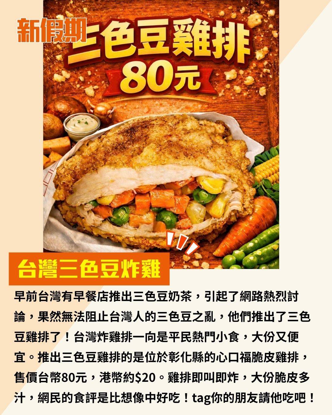 早前台灣有早餐店推出三色豆奶茶,引起了網路熱烈討論,果然無法阻止台灣人的三色豆之亂,他們推出了三色豆雞排了!台灣炸雞排一向是平民熱門小食,大份又便宜。推出三色豆雞排的是位於彰化縣的心口福脆皮雞排,售價台幣80元,港幣約$20。雞排即叫即炸,大份脆皮多汁,網民的食評是比想像中好吃!tag你的朋友請他吃吧!