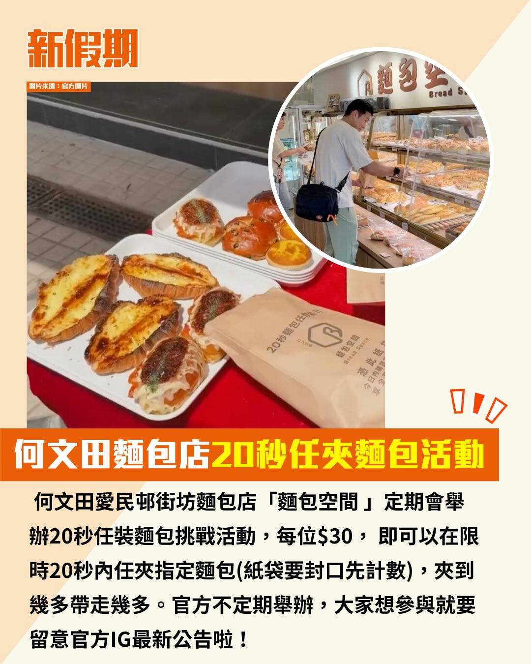 何文田愛民邨街坊麵包店「麵包空間 」定期會舉辦20秒任裝麵包挑戰活動,每位$30, 即可以在限時20秒內任夾指定麵包(紙袋要封口先計數),夾到幾多帶走幾多。官方不定期舉辦,大家想參與就要留意官方IG最新公告啦!