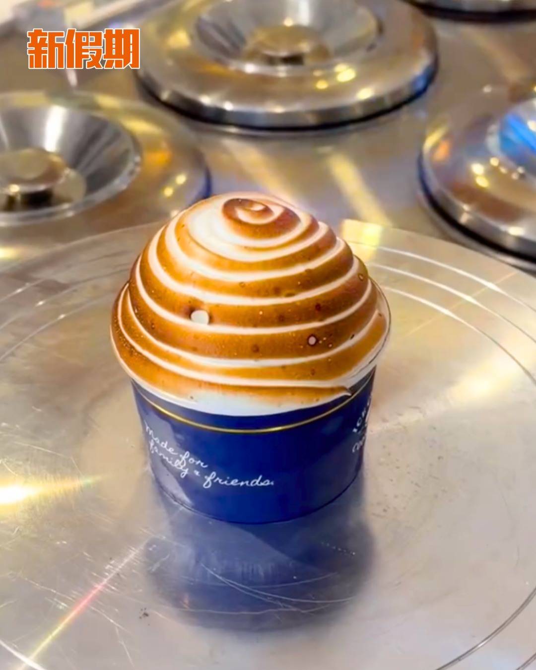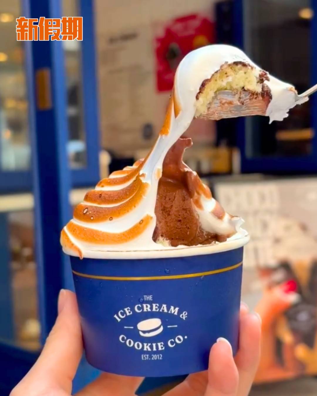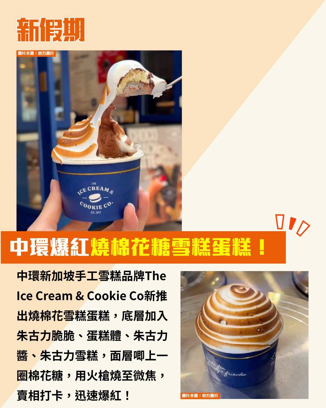 中環新加坡手工雪糕品牌The Ice Cream & Cookie Co新推出燒棉花雪糕蛋糕,底層加入朱古力脆脆、蛋糕體、朱古力醬、朱古力雪糕,面層唧上一圈棉花糖,用火槍燒至微焦,賣相打卡,迅速爆紅!