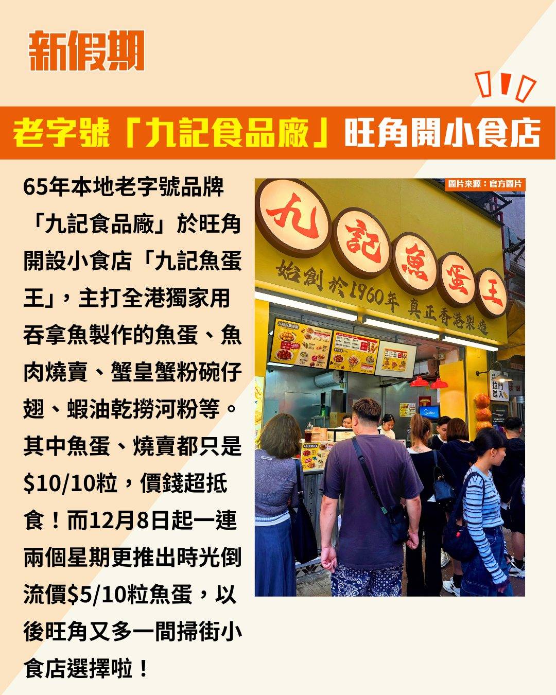 65年本地老字號品牌「九記食品廠」於旺角開設小食店「九記魚蛋王」,主打全港獨家用吞拿魚製作的魚蛋、魚肉燒賣、蟹皇蟹粉碗仔翅、蝦油乾撈河粉等。其中魚蛋、燒賣都只是$10/10粒,價錢超抵食!而12月8日起一連兩個星期更推出時光倒流價$5/10粒魚蛋,以後旺角又多一間掃街小食店選擇啦!