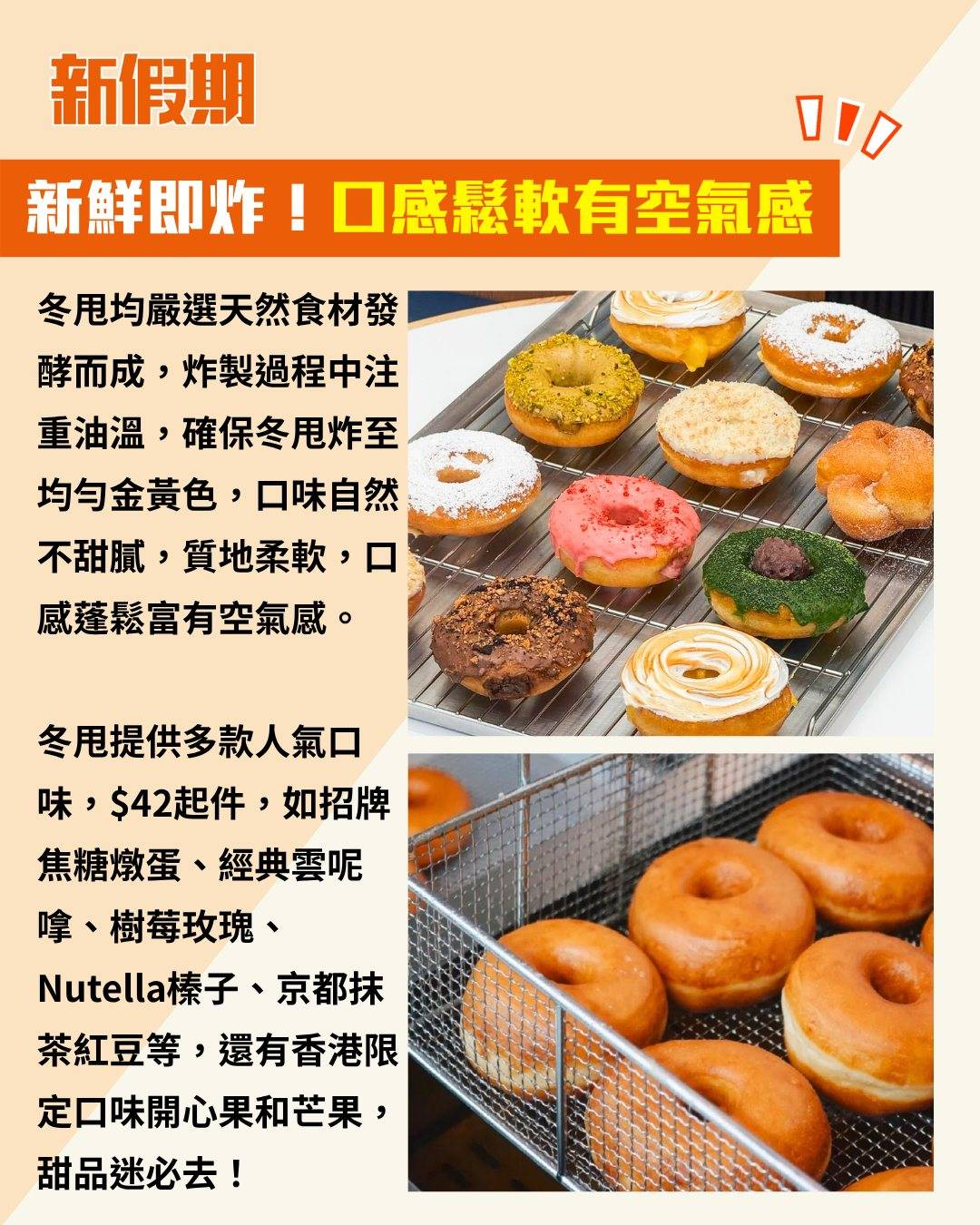 冬甩均嚴選天然食材發酵而成,炸製過程中注重油溫,確保冬甩炸至均勻金黃色,口味自然不甜膩,質地柔軟,口感蓬鬆富有空氣感。冬甩提供多款人氣口味,$42起件,如招牌焦糖燉蛋、經典雲呢嗱、樹莓玫瑰、Nutella榛子、京都抹茶紅豆等,還有香港限定口味開心果和芒果,甜品迷必去!