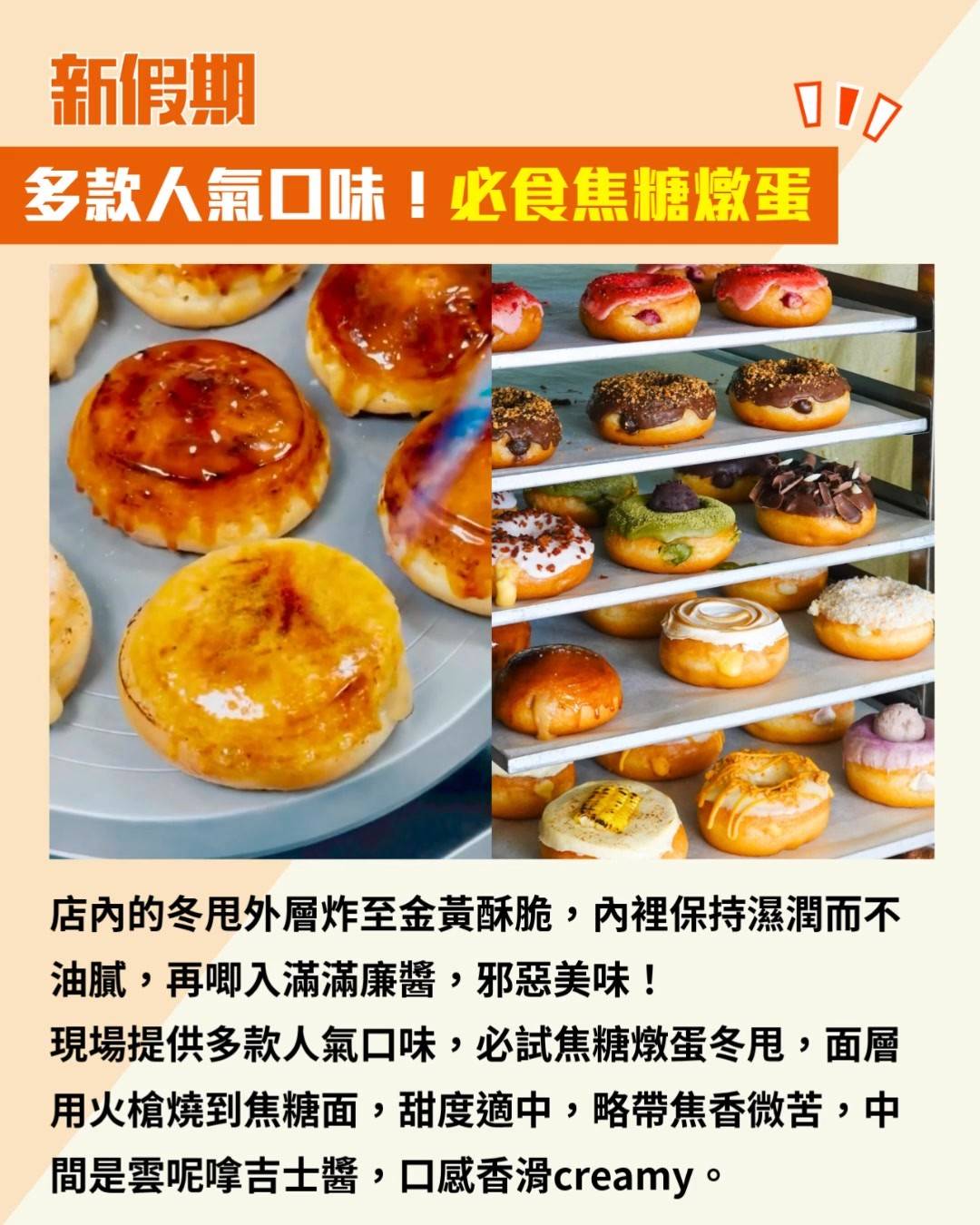 店內的冬甩外層炸至金黃酥脆,內裡保持濕潤而不油膩,再唧入滿滿廉醬,邪惡美味!現場提供多款人氣口味,必試焦糖燉蛋冬甩,面層用火槍燒到焦糖面,甜度適中,略帶焦香微苦,中間是雲呢嗱吉士醬,口感香滑creamy!