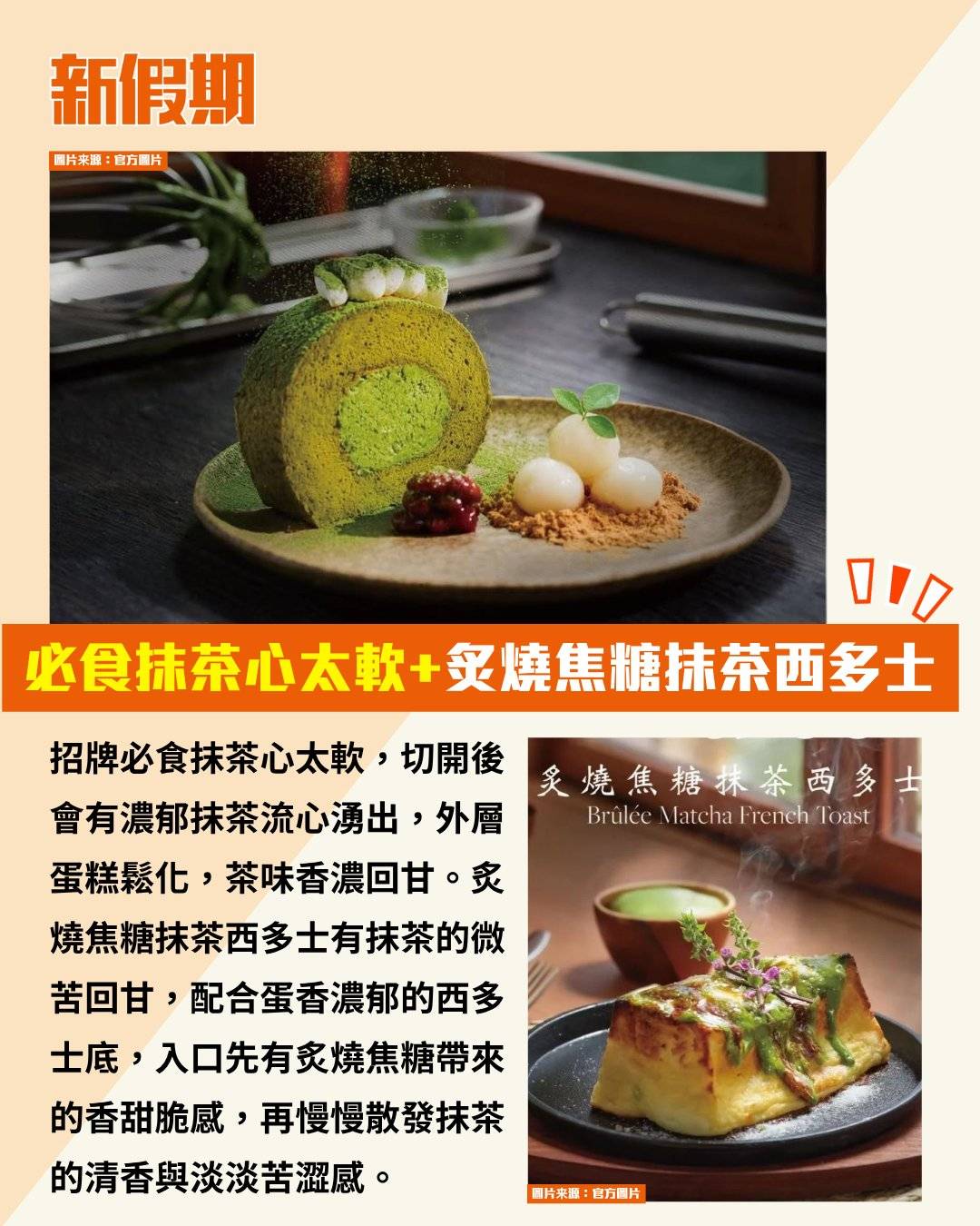 招牌必食抹茶心太軟,切開後會有濃郁抹茶流心湧出,外層蛋糕鬆化,茶味香濃回甘。炙燒焦糖抹茶西多士有抹茶的微苦回甘,配合蛋香濃郁的西多士底,入口先有炙燒焦糖帶來的香甜脆感,再慢慢散發抹茶的清香與淡淡苦澀感。