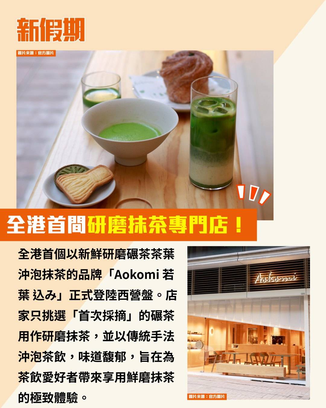 全港首個以新鮮研磨碾茶茶葉沖泡抹茶的品牌「Aokomi 若葉 込み」正式登陸西營盤。店家只挑選「首次採摘」的碾茶用作研磨抹茶,並以傳統手法沖泡茶飲,味道馥郁,旨在為茶飲愛好者帶來享用鮮磨抹茶的極致體驗。