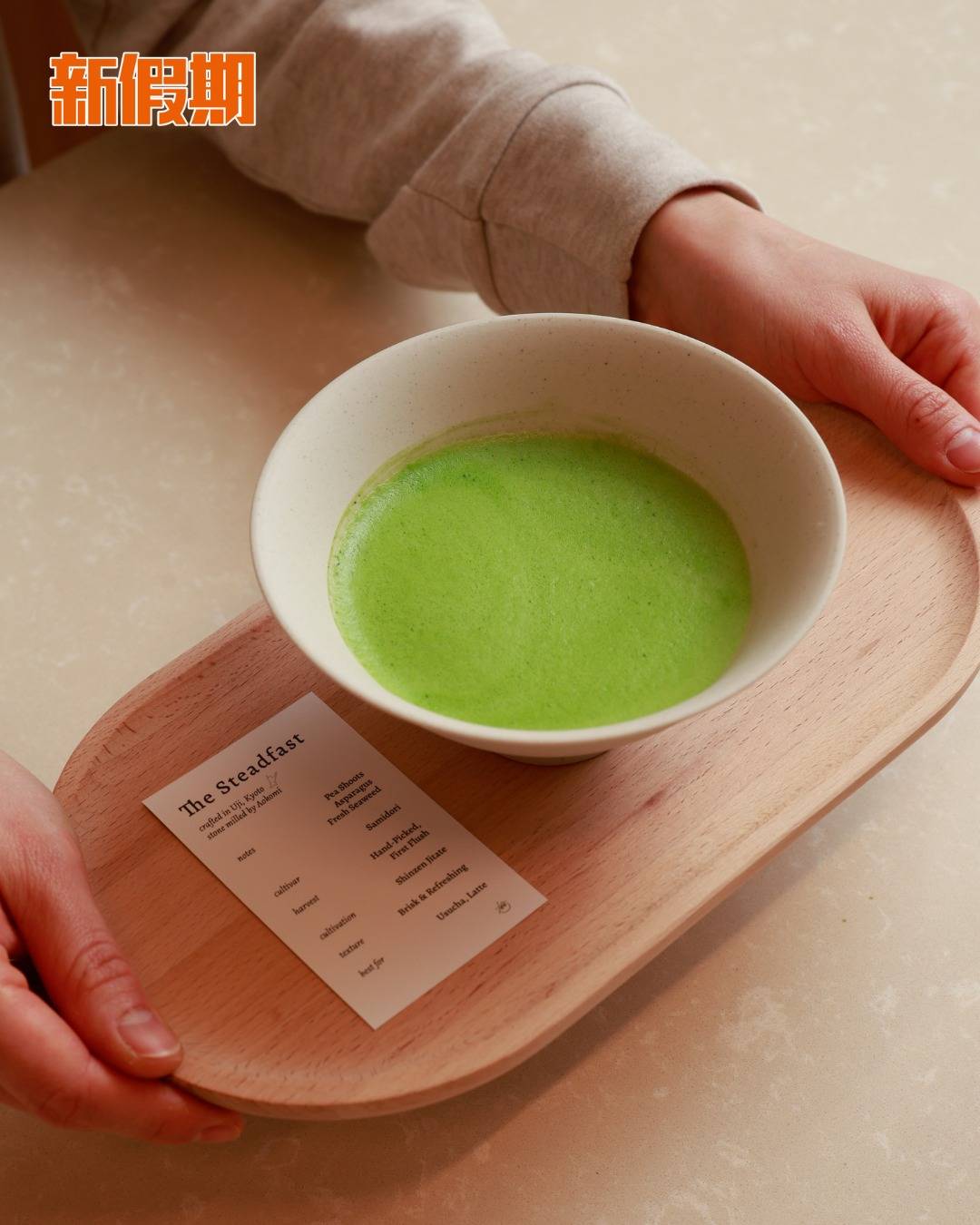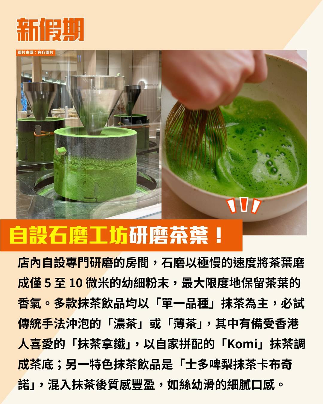 店內自設專門研磨的房間,石磨以極慢的速度將茶葉磨成僅 5 至 10 微米的幼細粉末,最大限度地保留茶葉的香氣。多款抹茶飲品均以「單一品種」抹茶為主,必試傳統手法沖泡的「濃茶」或「薄茶」,其中有備受香港人喜愛的「抹茶拿鐵」,以自家拼配的「Komi」抹茶調成茶底;另一特色抹茶飲品是「士多啤梨抹茶卡布奇諾」,混入抹茶後質感豐盈,如絲幼滑的細膩口感。