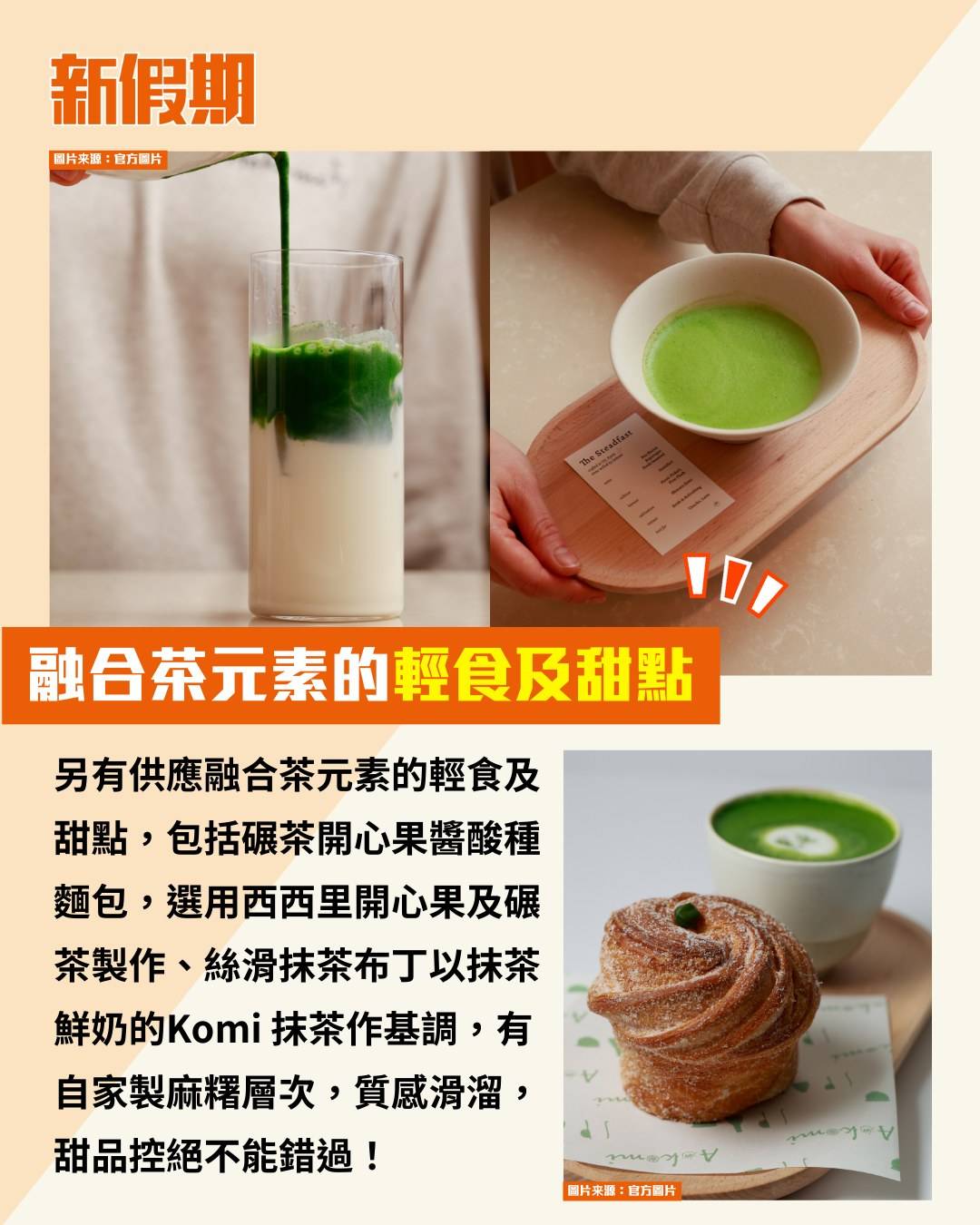 另有供應融合茶元素的輕食及甜點,包括碾茶開心果醬酸種麵包,選用西西里開心果及碾茶製作、絲滑抹茶布丁以抹茶鮮奶的Komi 抹茶作基調,有自家製麻糬層次,質感滑溜,甜品控絕不能錯過!