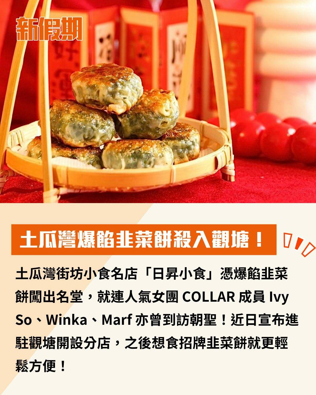 土瓜灣街坊小食名店「日昇小食」憑爆餡韭菜餅闖出名堂,就連人氣女團 COLLAR 成員 Ivy So、Winka、Marf 亦曾到訪朝聖!近日宣布進駐觀塘開設分店,之後想食招牌韭菜餅就更輕鬆方便!