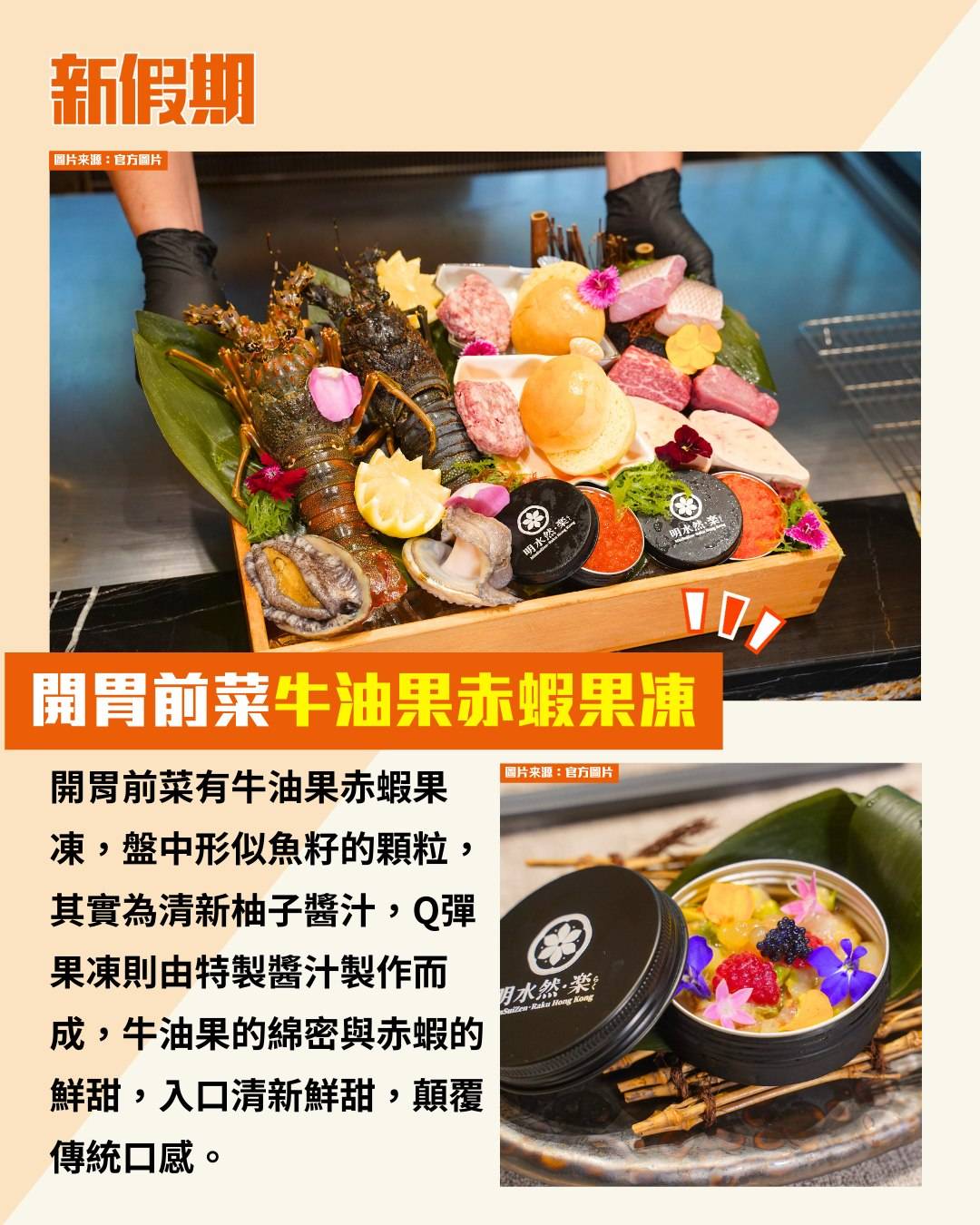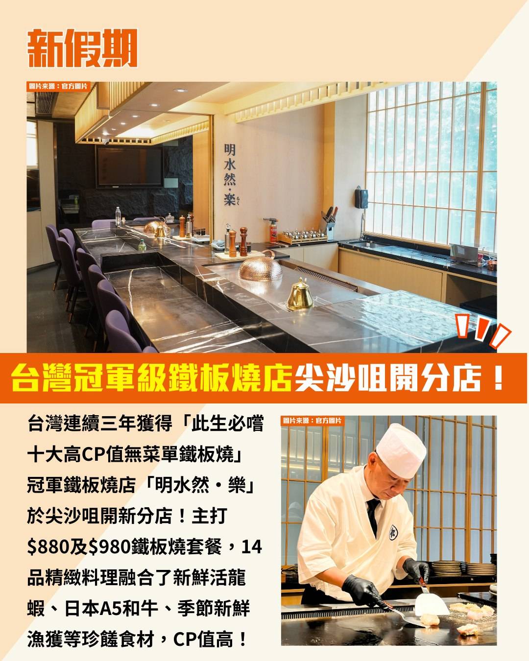 台灣連續三年獲得「此生必嚐十大高CP值無菜單鐵板燒」冠軍鐵板燒店「明水然・樂」於尖沙咀開新分店!主打$880及$980鐵板燒套餐,14品精緻料理融合了新鮮活龍蝦、日本A5和牛、季節新鮮漁獲等珍饈食材,CP值高!
