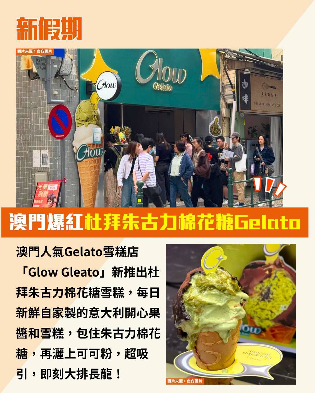 澳門人氣Gelato雪糕店「Glow Gleato」新推出杜拜朱古力棉花糖雪糕,每日新鮮自家製的意大利開心果醬和雪糕,包住朱古力棉花糖,再灑上可可粉,超吸引,即刻大排長龍!