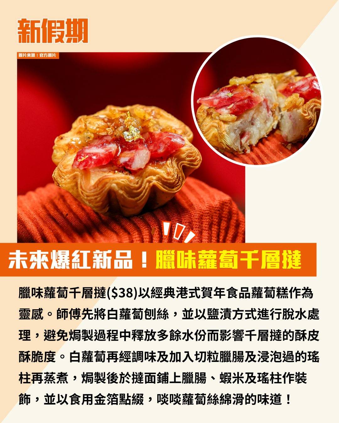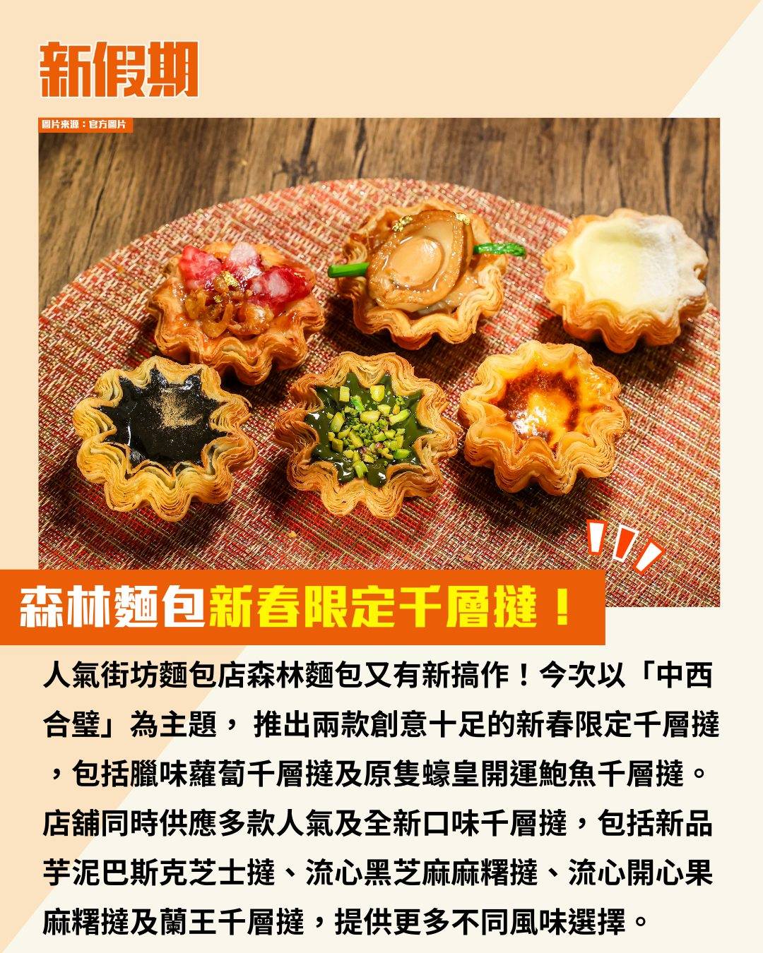 人氣街坊麵包店森林麵包又有新搞作!今次以「中西合璧」為主題, 推出兩款創意十足的新春限定千層撻 ,包括臘味蘿蔔千層撻及原隻蠔皇開運鮑魚千層撻。店舖同時供應多款人氣及全新口味千層撻,包括新品芋泥巴斯克芝士撻、流心黑芝麻麻糬撻、流心開心果麻糬撻及蘭王千層撻,提供更多不同風味選擇。