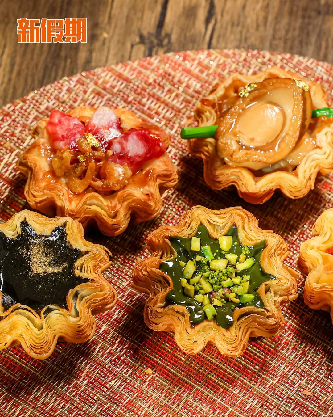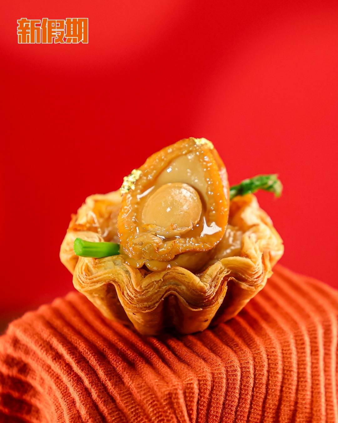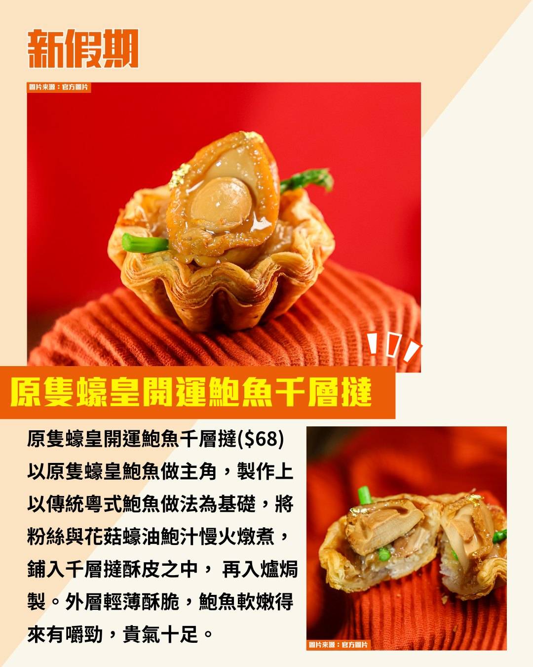 原隻蠔皇開運鮑魚千層撻($68) 以原隻蠔皇鮑魚做主角,製作上以傳統粵式鮑魚做法為基礎,將粉絲與花菇蠔油鮑汁慢火燉煮,鋪入千層撻酥皮之中, 再入爐焗製。外層輕薄酥脆,鮑魚軟嫩得來有嚼勁,貴氣十足。