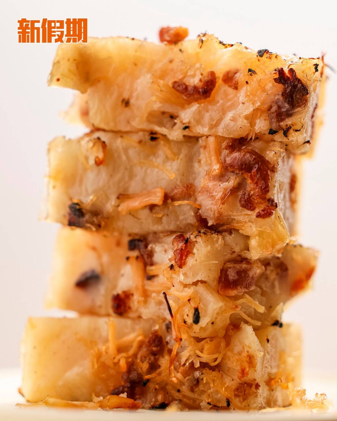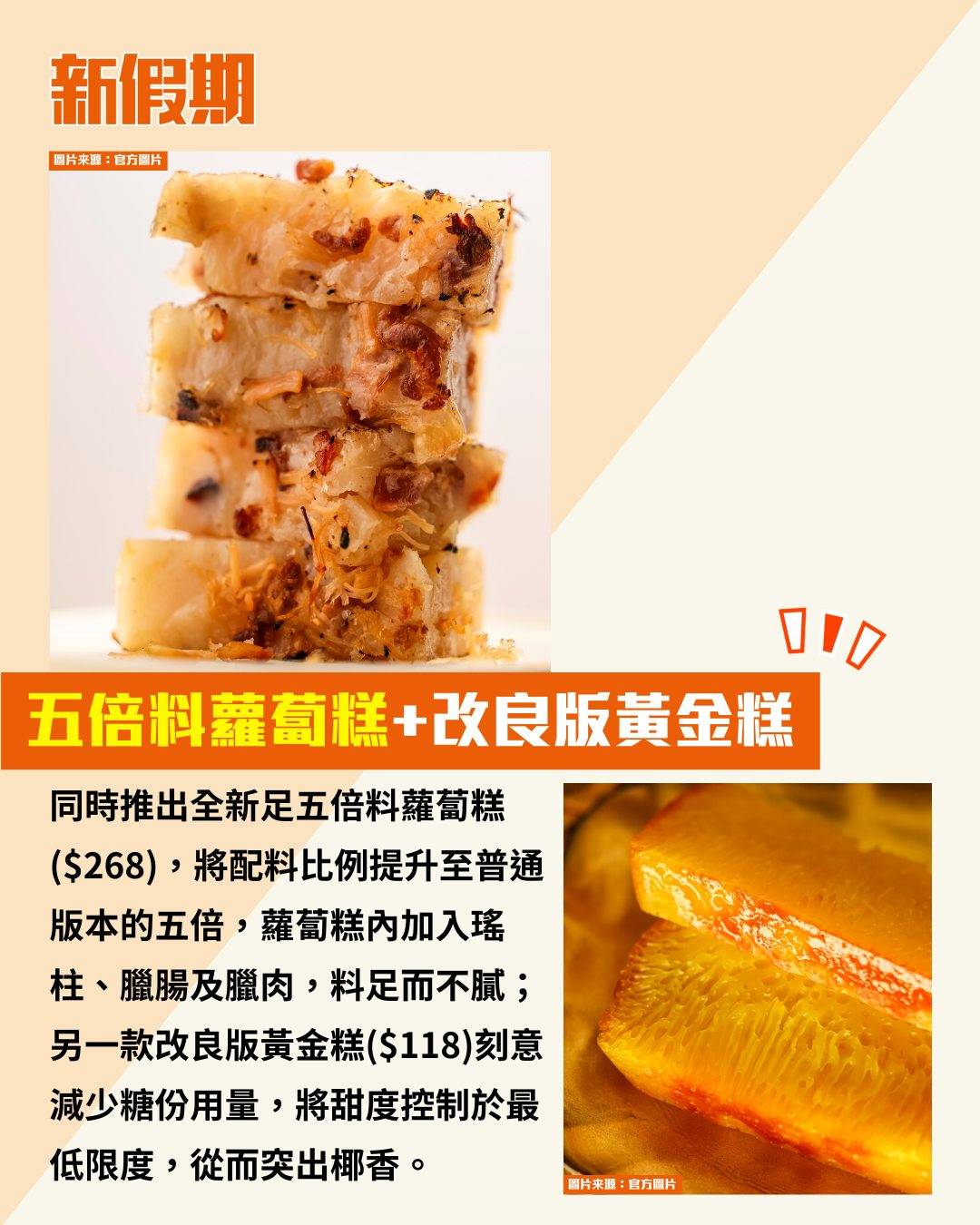 同時推出全新足五倍料蘿蔔糕($268),將配料比例提升至普通版本的五倍,蘿蔔糕內加入瑤柱、臘腸及臘肉,料足而不膩;另一款改良版黃金糕($118)刻意減少糖份用量,將甜度控制於最低限度,從而突出椰香。