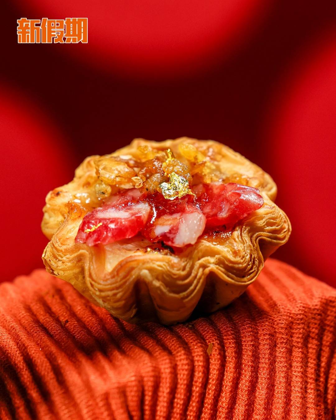 臘味蘿蔔千層撻($38)以經典港式賀年食品蘿蔔糕作為靈感。師傅先將白蘿蔔刨絲,並以鹽漬方式進行脫水處理,避免焗製過程中釋放多餘水份而影響千層撻的酥皮酥脆度。白蘿蔔再經調味及加入切粒臘腸及浸泡過的瑤柱再蒸煮,焗製後於撻面鋪上臘腸、蝦米及瑤柱作裝飾,並以食用金箔點綴,啖啖蘿蔔絲綿滑的味道!