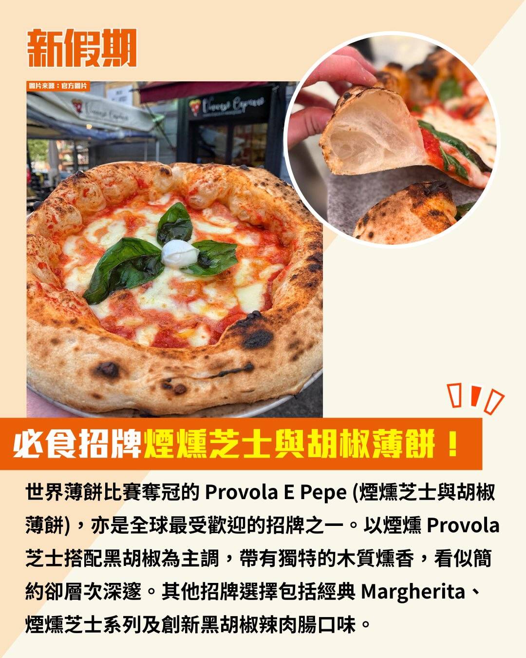 世界薄餅比賽奪冠的 Provola E Pepe (煙燻芝士與胡椒薄餅),亦是全球最受歡迎的招牌之一。以煙燻 Provola 芝士搭配黑胡椒為主調,帶有獨特的木質燻香,看似簡約卻層次深邃。其他招牌選擇包括經典 Margherita、煙燻芝士系列及創新黑胡椒辣肉腸口味。