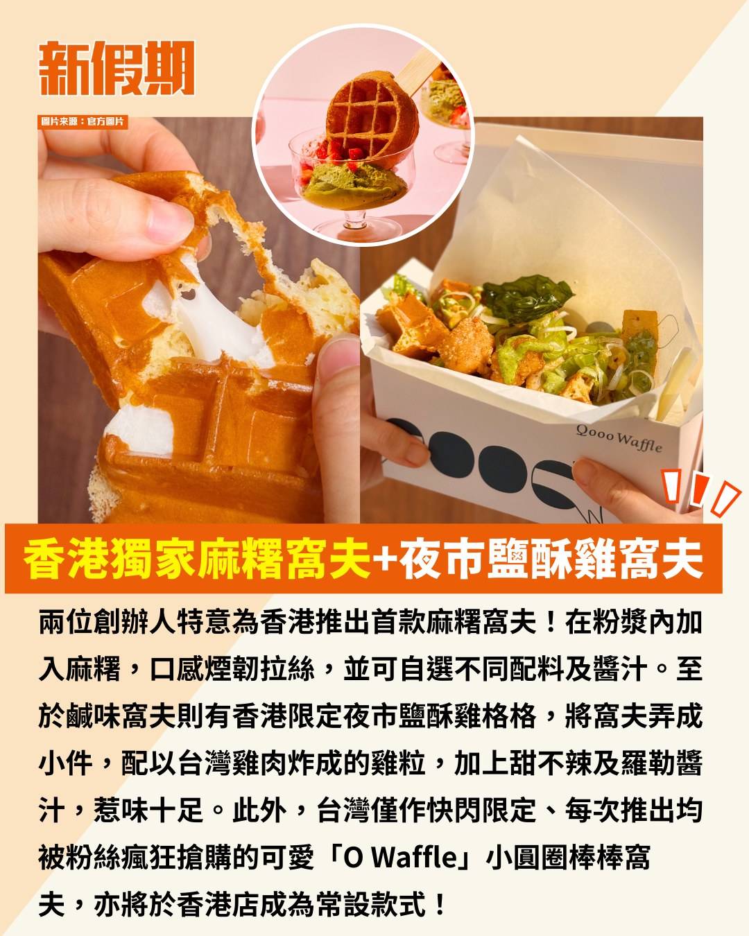 兩位創辦人特意為香港推出首款麻糬窩夫!在粉漿內加入麻糬,口感煙韌拉絲,並可自選不同配料及醬汁。至於鹹味窩夫則有香港限定夜市鹽酥雞格格,將窩夫弄成小件,配以台灣雞肉炸成的雞粒,加上甜不辣及羅勒醬汁,惹味十足。此外,台灣僅作快閃限定、每次推出均被粉絲瘋狂搶購的可愛「O Waffle」小圓圈棒棒窩夫,亦將於香港店成為常設款式!
