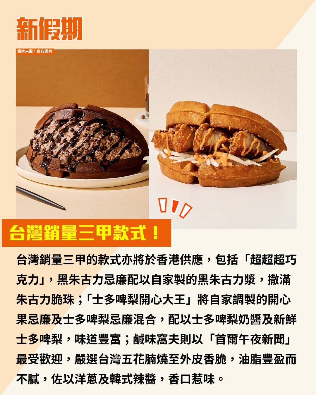 台灣銷量三甲的款式亦將於香港供應,包括「超超超巧克力」,黑朱古力忌廉配以自家製的黑朱古力漿,撒滿朱古力脆珠;「士多啤梨開心大王」將自家調製的開心果忌廉及士多啤梨忌廉混合,配以士多啤梨奶醬及新鮮士多啤梨,味道豐富;鹹味窩夫則以「首爾午夜新聞」最受歡迎,嚴選台灣五花腩燒至外皮香脆,油脂豐盈而不膩,佐以洋蔥及韓式辣醬,香口惹味。