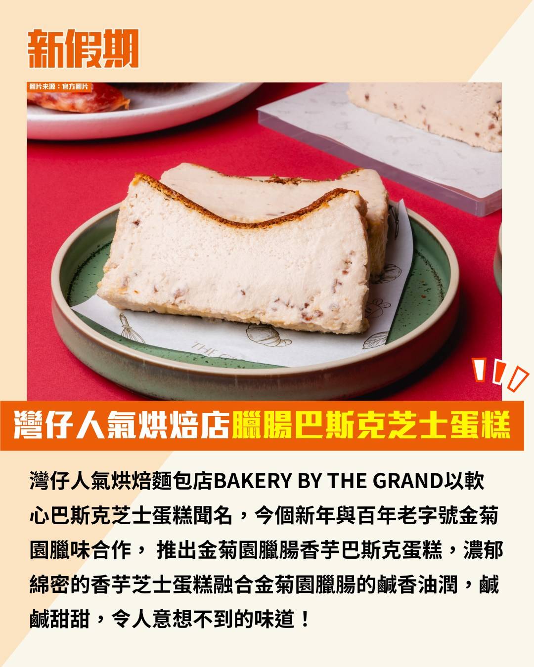 灣仔人氣烘焙麵包店BAKERY BY THE GRAND以軟心巴斯克芝士蛋糕聞名,今個新年與百年老字號金菊園臘味合作, 推出金菊園臘腸香芋巴斯克蛋糕,濃郁綿密的香芋芝士蛋糕融合金菊園臘腸的鹹香油潤,鹹鹹甜甜,令人意想不到的味道!