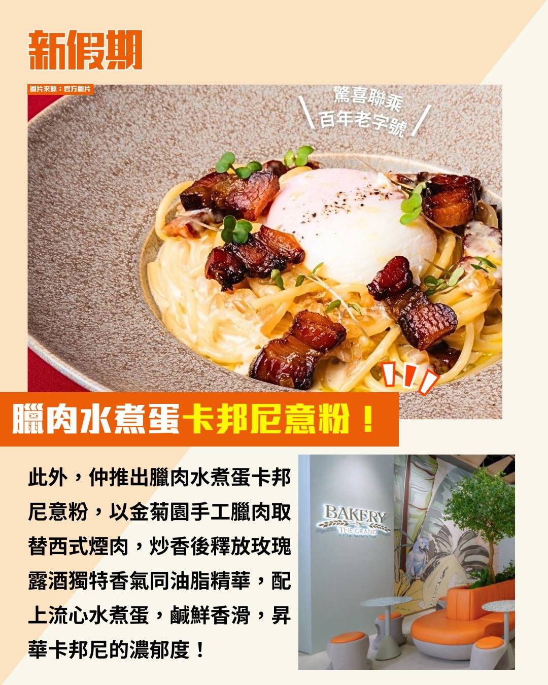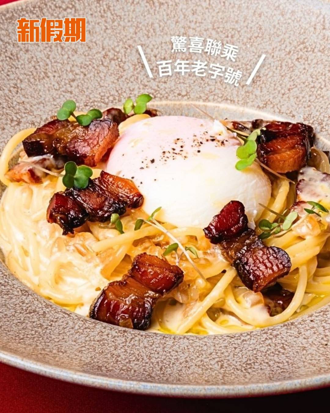 此外,仲推出臘肉水煮蛋卡邦尼意粉,以金菊園手工臘肉取替西式煙肉,炒香後釋放玫瑰露酒獨特香氣同油脂精華,配上流心水煮蛋,鹹鮮香滑,昇華卡邦尼的濃郁度!