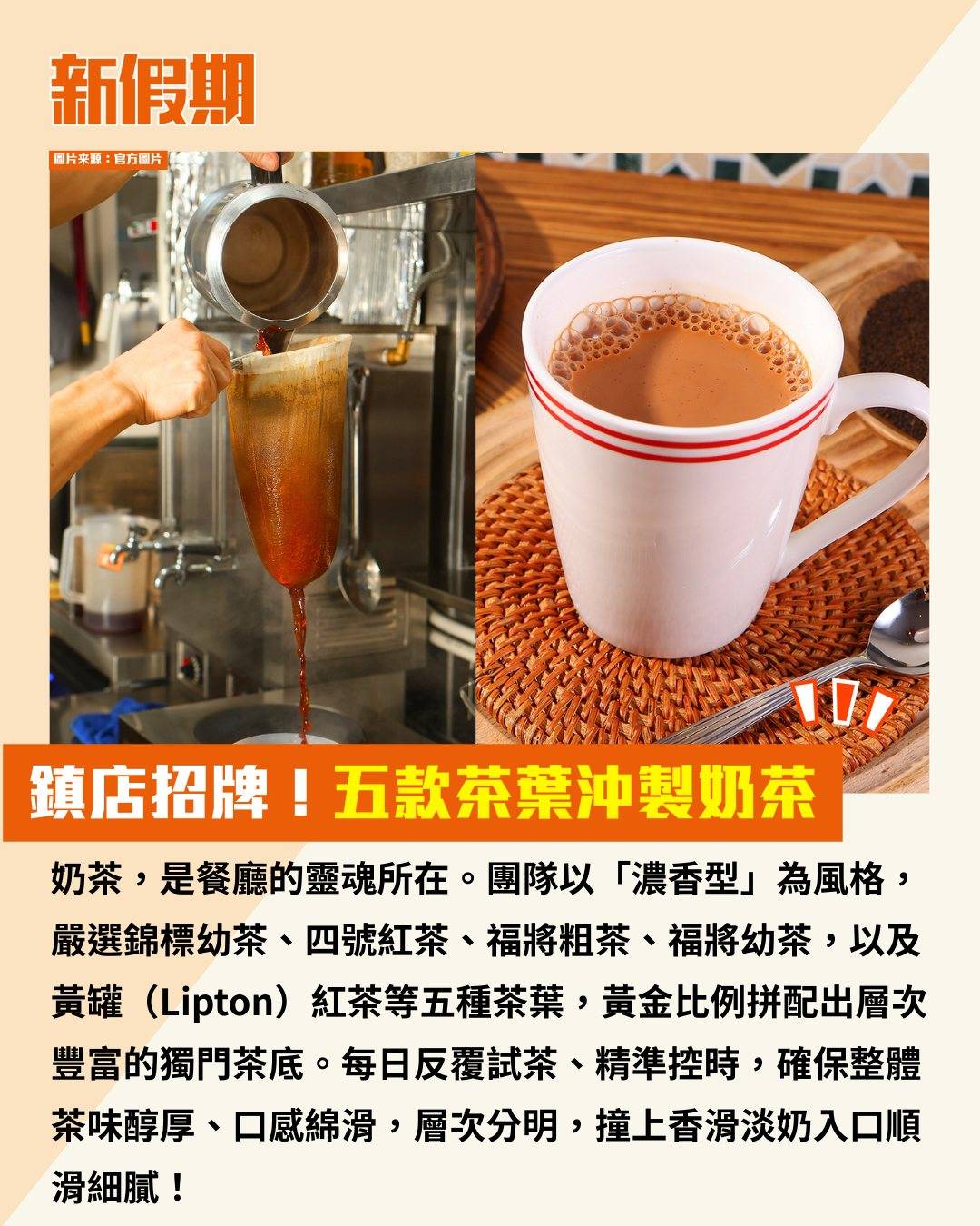 奶茶,是餐廳的靈魂所在。團隊以「濃香型」為風格,嚴選錦標幼茶、四號紅茶、福將粗茶、福將幼茶,以及黃罐(Lipton)紅茶等五種茶葉,黃金比例拼配出層次豐富的獨門茶底。每日反覆試茶、精準控時,確保整體茶味醇厚、口感綿滑,層次分明,撞上香滑淡奶入口順滑細膩!