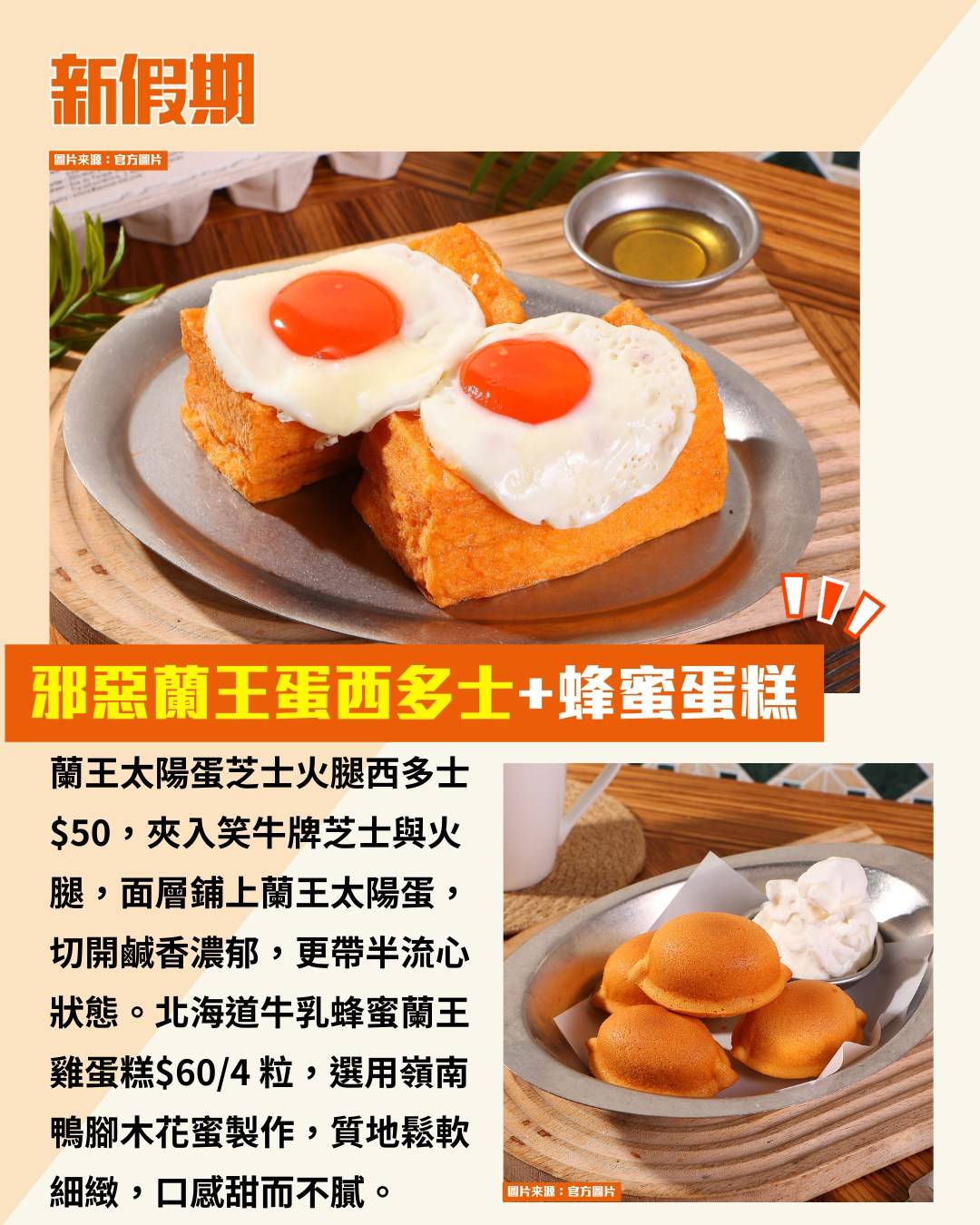 蘭王太陽蛋芝士火腿西多士$50,夾入笑牛牌芝士與火腿,面層鋪上蘭王太陽蛋,切開鹹香濃郁,更帶半流心狀態。北海道牛乳蜂蜜蘭王雞蛋糕$60/4 粒,選用嶺南鴨腳木花蜜製作,質地鬆軟細緻,口感甜而不膩。