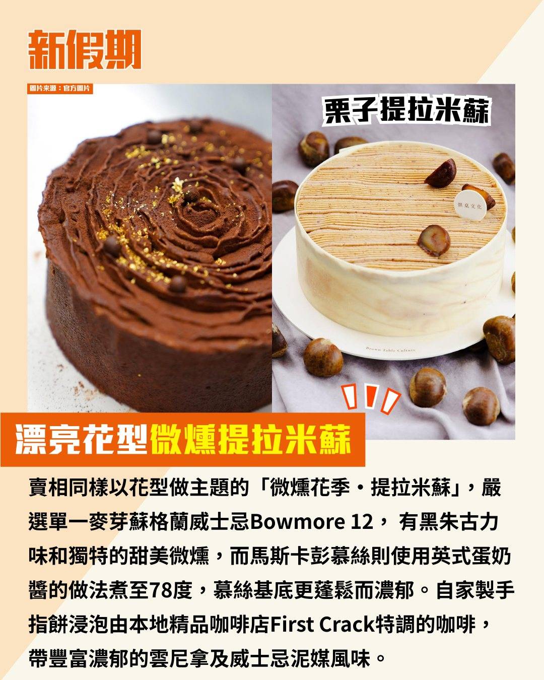 賣相同樣以花型做主題的「微燻花季‧提拉米蘇」,嚴選單一麥芽蘇格蘭威士忌Bowmore 12, 有黑朱古力味和獨特的甜美微燻,而馬斯卡彭慕絲則使用英式蛋奶醬的做法煮至78度,慕絲基底更蓬鬆而濃郁。自家製手指餅浸泡由本地精品咖啡店First Crack特調的咖啡,帶豐富濃郁的雲尼拿及威士忌泥媒風味。