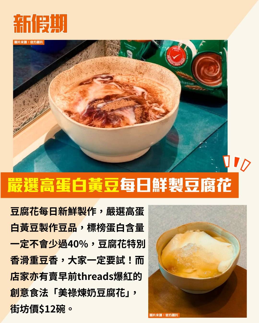 豆腐花每日新鮮製作,嚴選高蛋白黃豆製作豆品,標榜蛋白含量一定不會少過40%,豆腐花特別香滑重豆香,大家一定要試!而店家亦有賣早前threads爆紅的創意食法「美祿煉奶豆腐花」,街坊價$12碗。