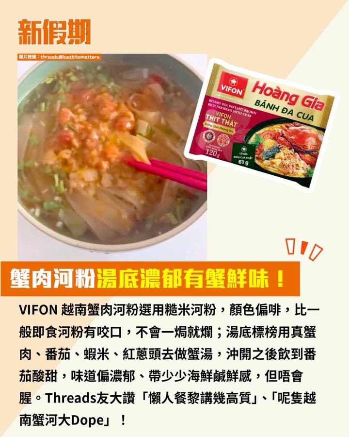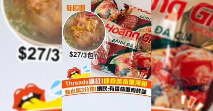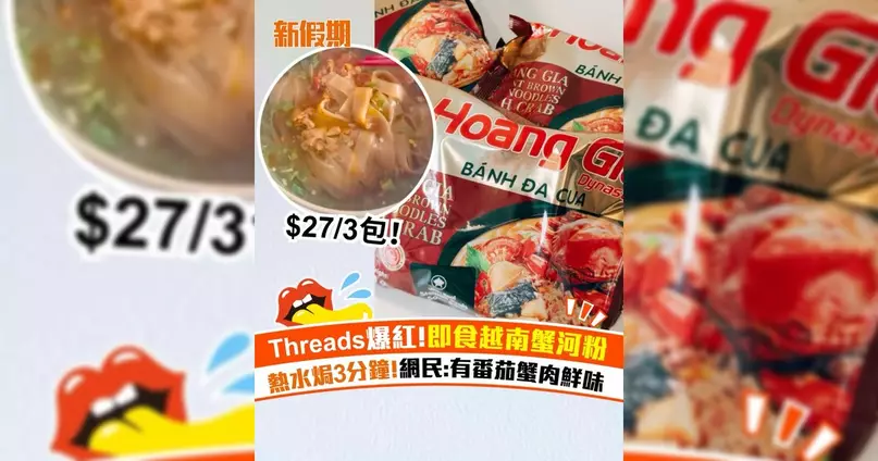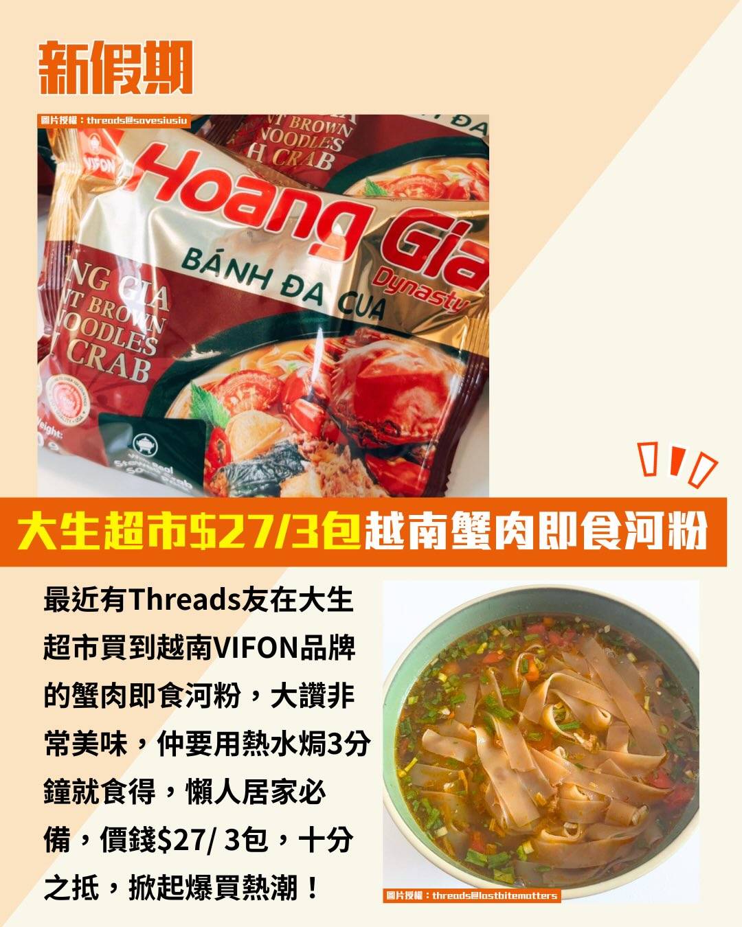 最近有Threads友在大生超市買到越南VIFON品牌的蟹肉即食河粉,大讚非常美味,仲要用熱水焗3分鐘就食得,懶人居家必備,價錢$27/ 3包,十分之抵,掀起爆買熱潮!