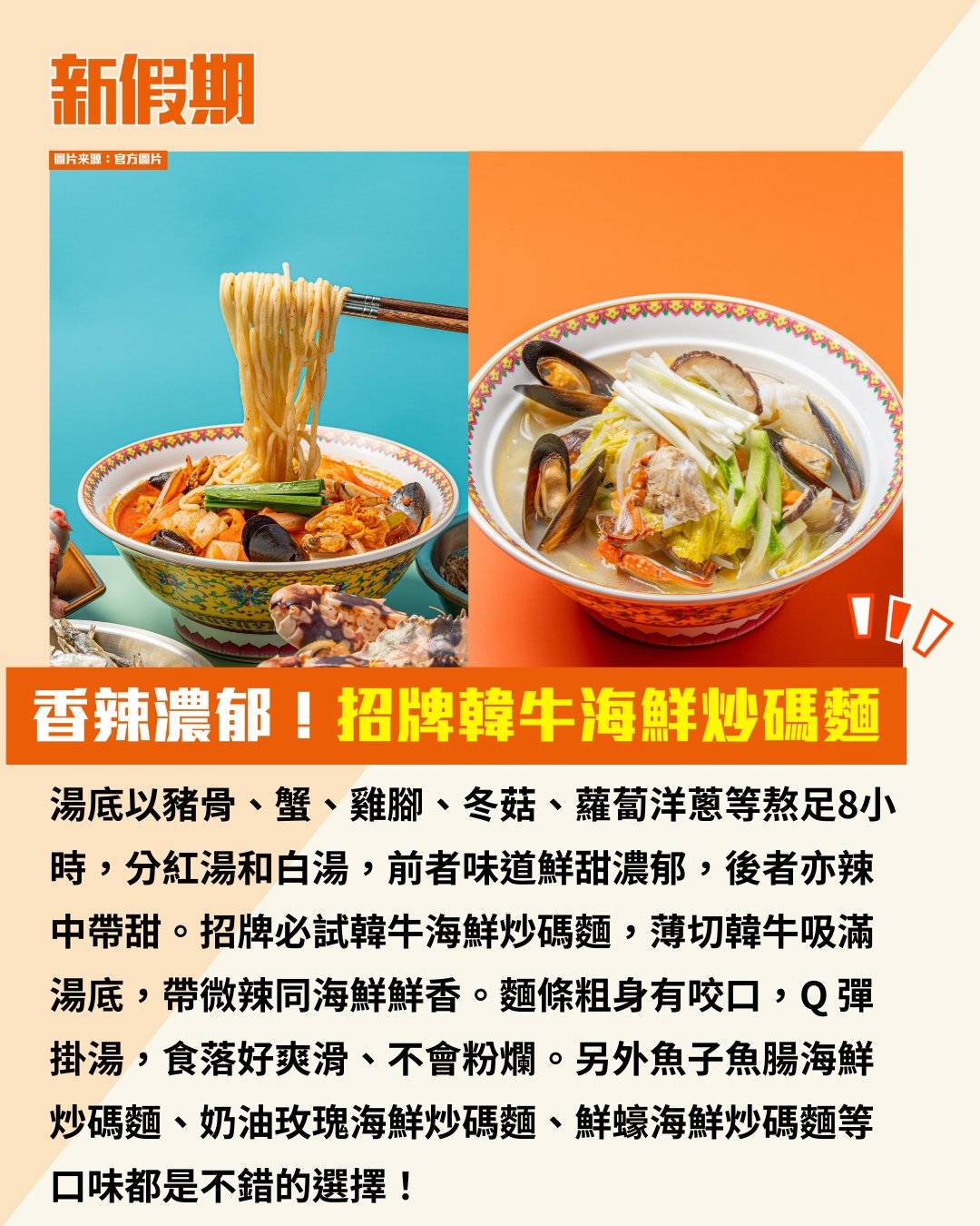 湯底以豬骨、蟹、雞腳、冬菇、蘿蔔洋蔥等熬足8小時,分紅湯和白湯,前者味道鮮甜濃郁,後者亦辣中帶甜。招牌必試韓牛海鮮炒碼麵,薄切韓牛吸滿湯底,帶微辣同海鮮鮮香。麵條粗身有咬口,Q 彈掛湯,食落好爽滑、不會粉爛。另外魚子魚腸海鮮炒碼麵、奶油玫瑰海鮮炒碼麵、鮮蠔海鮮炒碼麵等口味都是不錯的選擇!