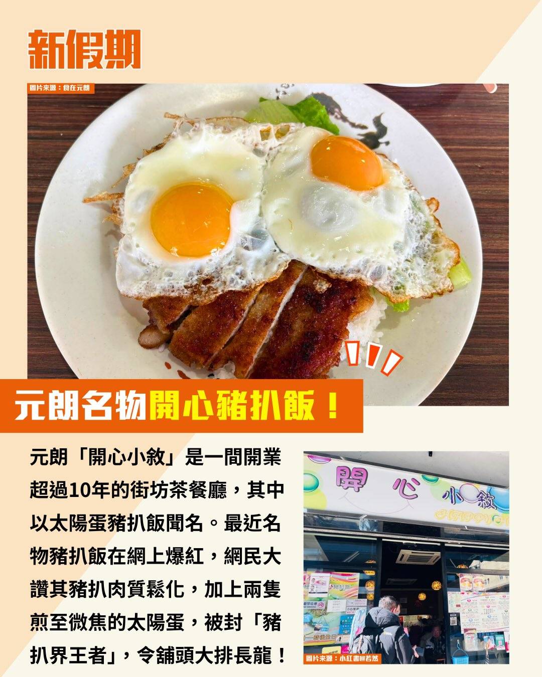 元朗「開心小敘」是一間開業超過10年的街坊茶餐廳,其中以太陽蛋豬扒飯聞名。最近名物豬扒飯在網上爆紅,網民大讚其豬扒肉質鬆化,加上兩隻煎至微焦的太陽蛋,被封「豬扒界王者」,令舖頭大排長龍!