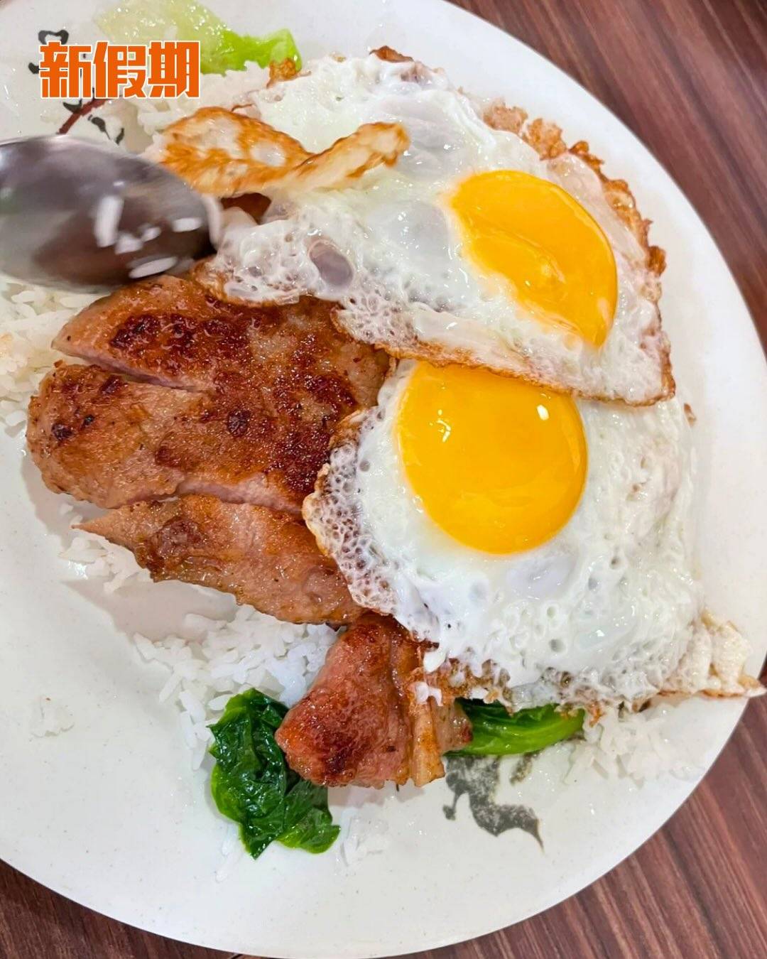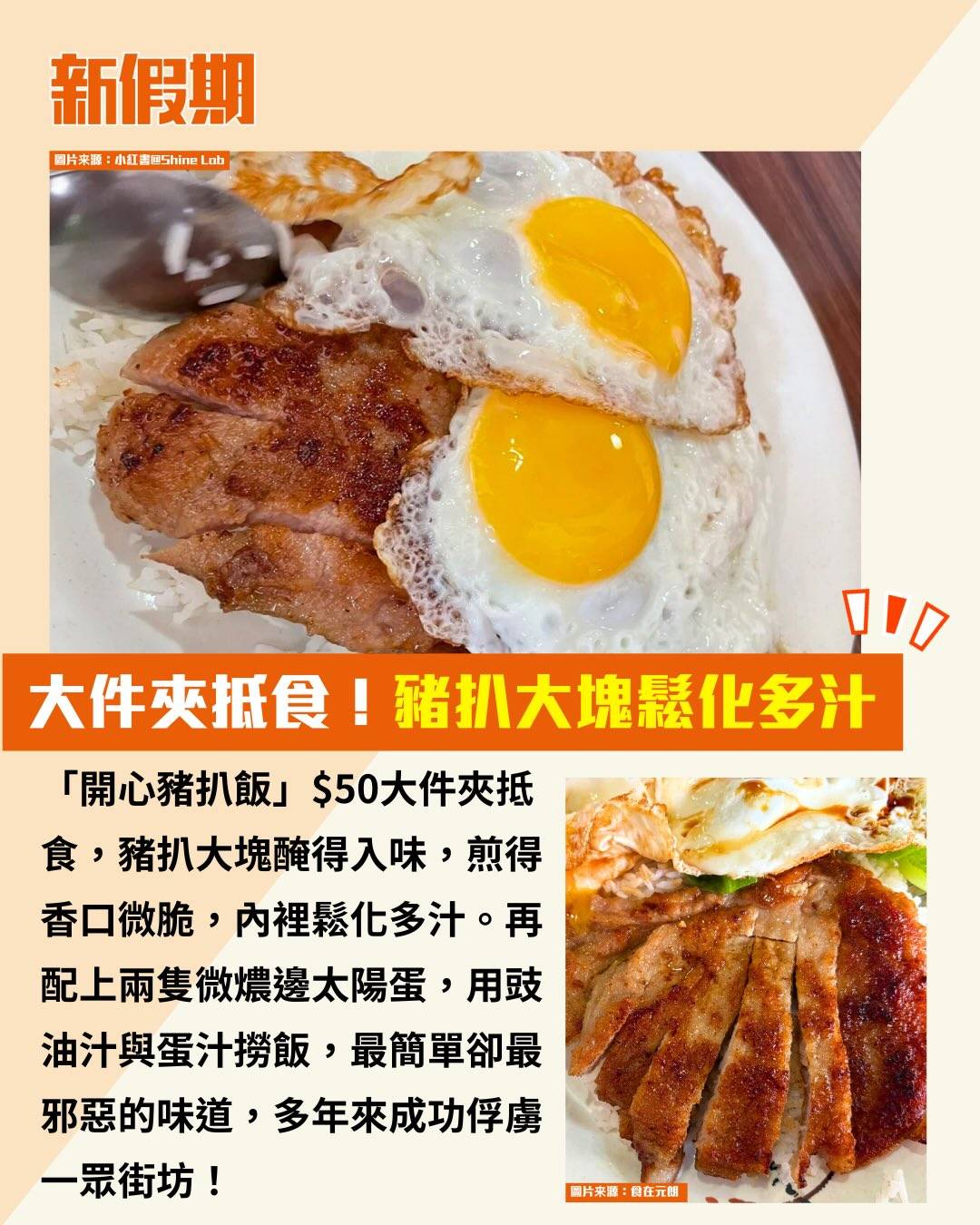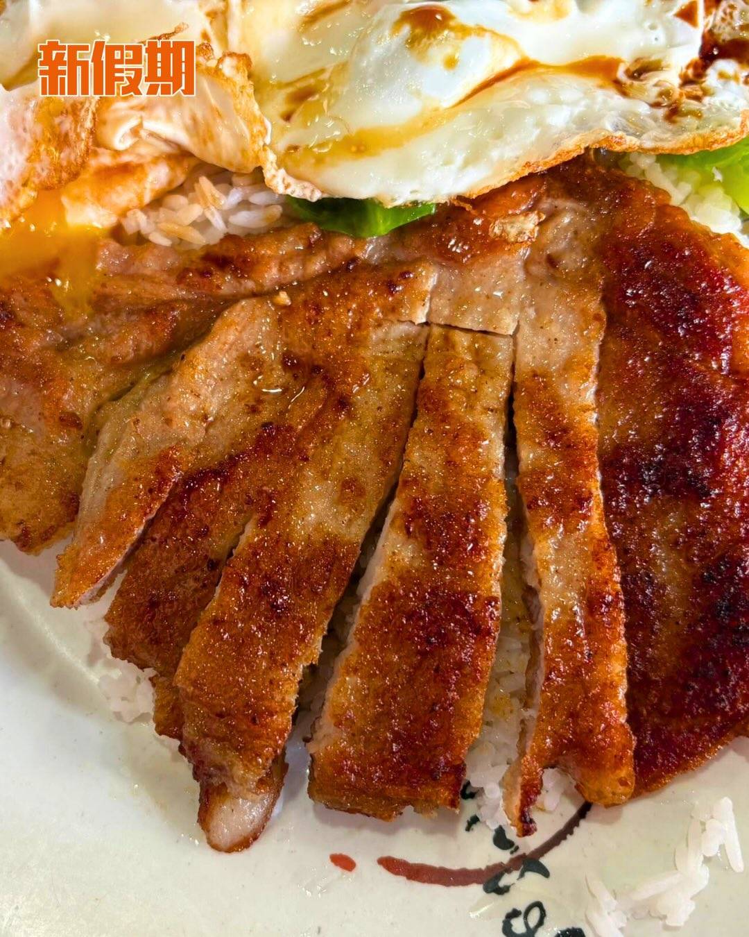 「開心豬扒飯」$50大件夾抵食,豬扒大塊醃得入味,煎得香口微脆,內裡鬆化多汁。再配上兩隻微燶邊太陽蛋,用豉油汁與蛋汁撈飯,最簡單卻最邪惡的味道,多年來成功俘虜一眾街坊!