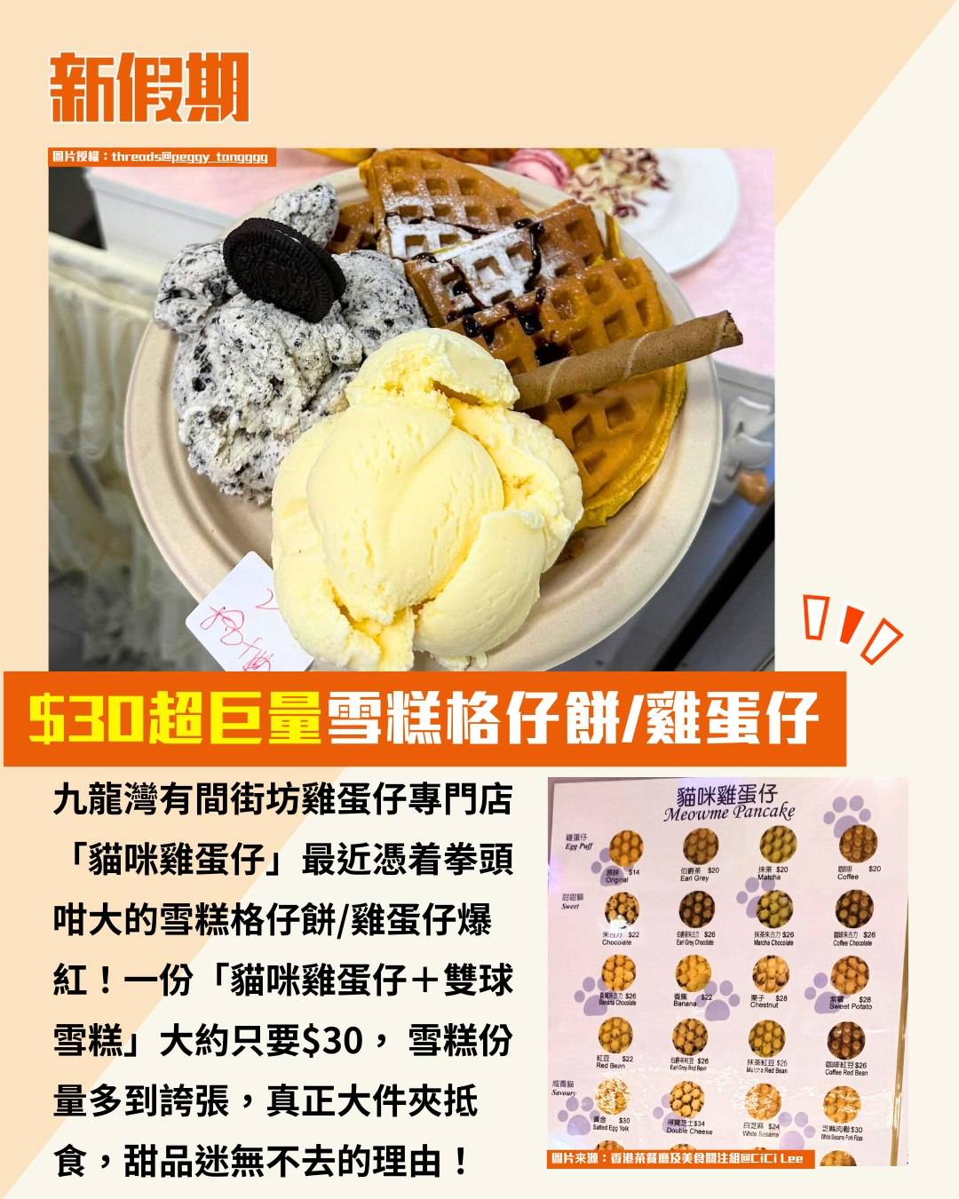 九龍灣「貓咪雞蛋仔」$30超巨量雪糕格仔餅/雞蛋仔