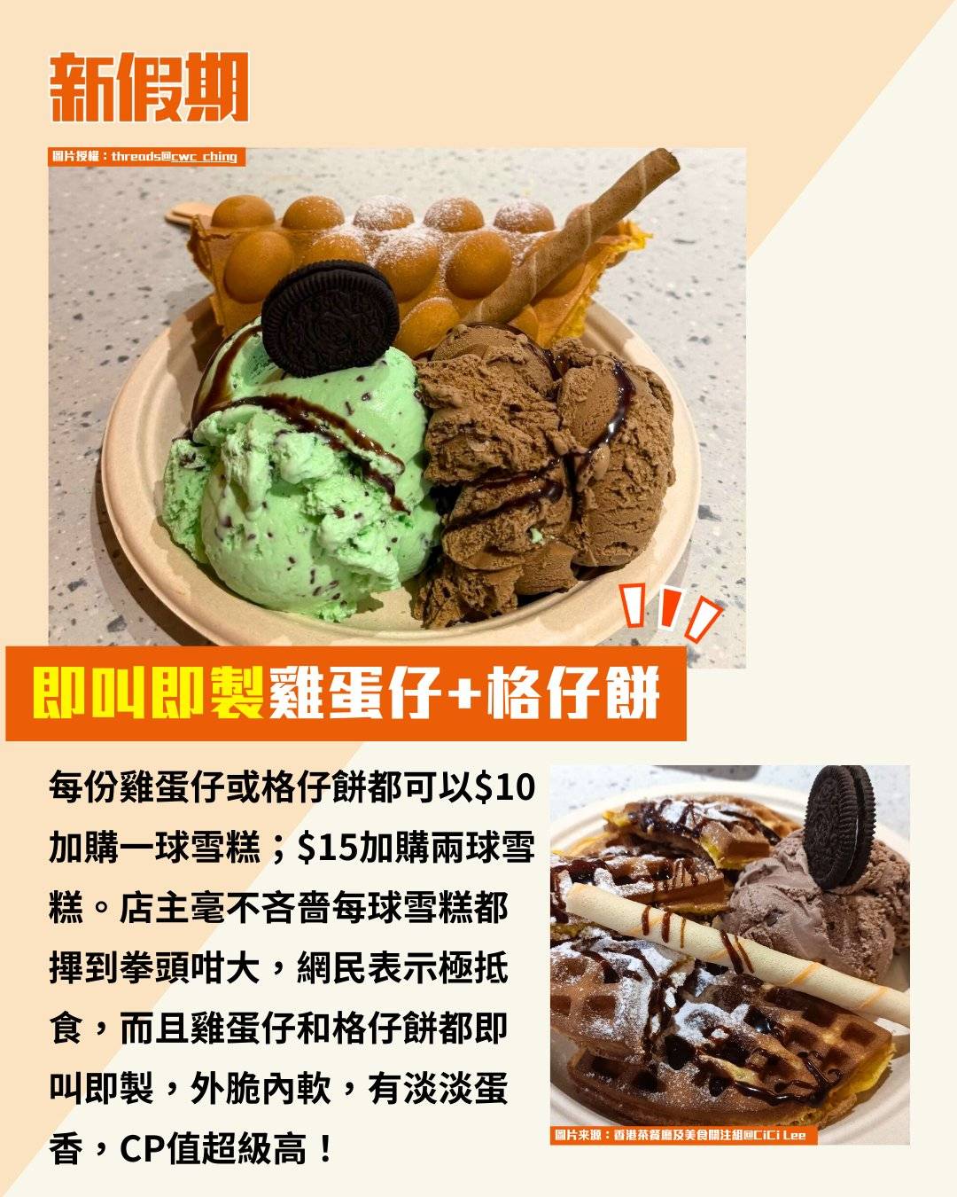 每份雞蛋仔或格仔餅都可以$10加購一球雪糕;$15加購兩球雪糕。店主毫不吝嗇每球雪糕都𢳂到拳頭咁大,網民表示極抵食,而且雞蛋仔和格仔餅都即叫即製,外脆內軟,有淡淡蛋香,CP值超級高!
