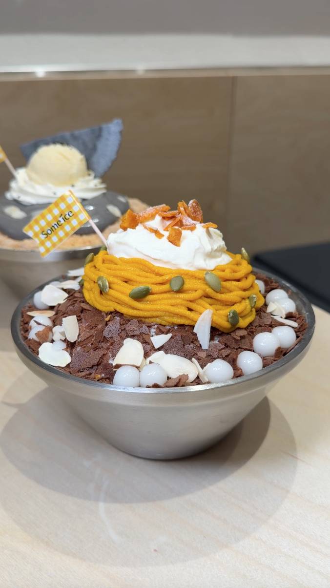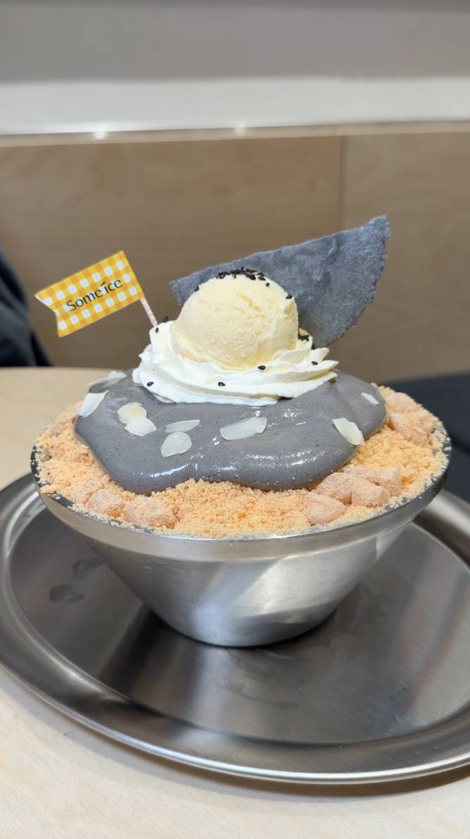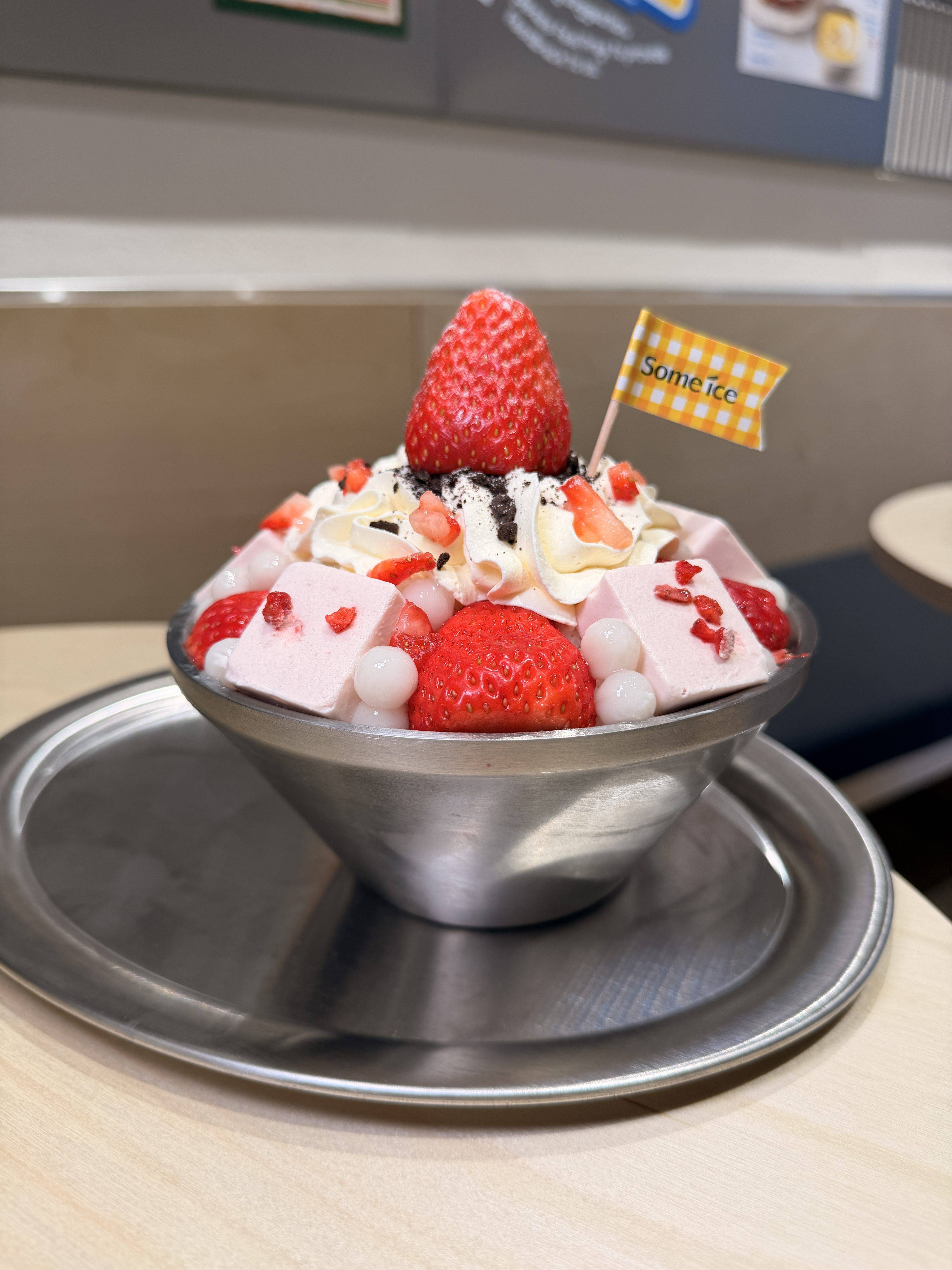 位於佐敦的韓式刨冰小店「Someice」,主打韓式雪花冰,提供超過十款口味選擇,由經典至創意款式一應俱全,當中以黑芝麻芋泥冰最為吸睛。 一大碗牛奶味雪花冰堆成小山,雪花細緻如絲、入口即融,搭配厚厚一層黑芝麻芋泥,質感濃稠順滑,芝麻香與芋泥綿密感交疊,再加上黃豆粉麻糬粒增添煙韌咬口,層次感極豐富。 另一人氣之選是冬日限定的士多啤梨奶磚冰,嚴選日本進口士多啤梨,自家熬煮草莓醬搭配牛奶雪花冰及草莓奶凍,酸甜清爽,視覺上是滿滿粉紅堆砌,打卡效果十足。
