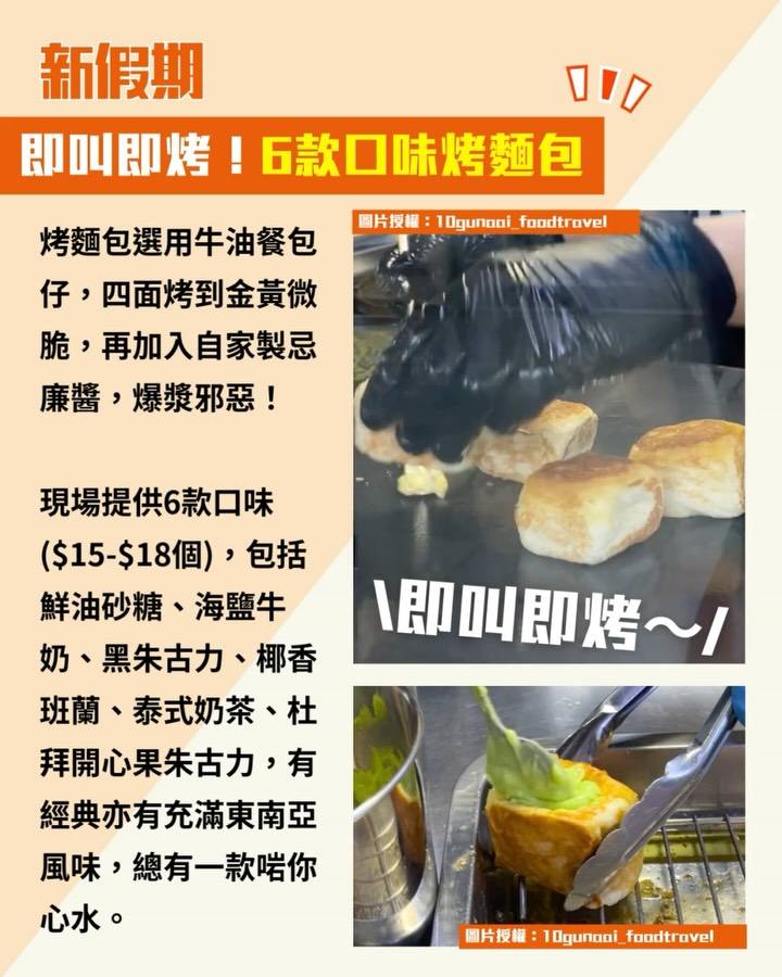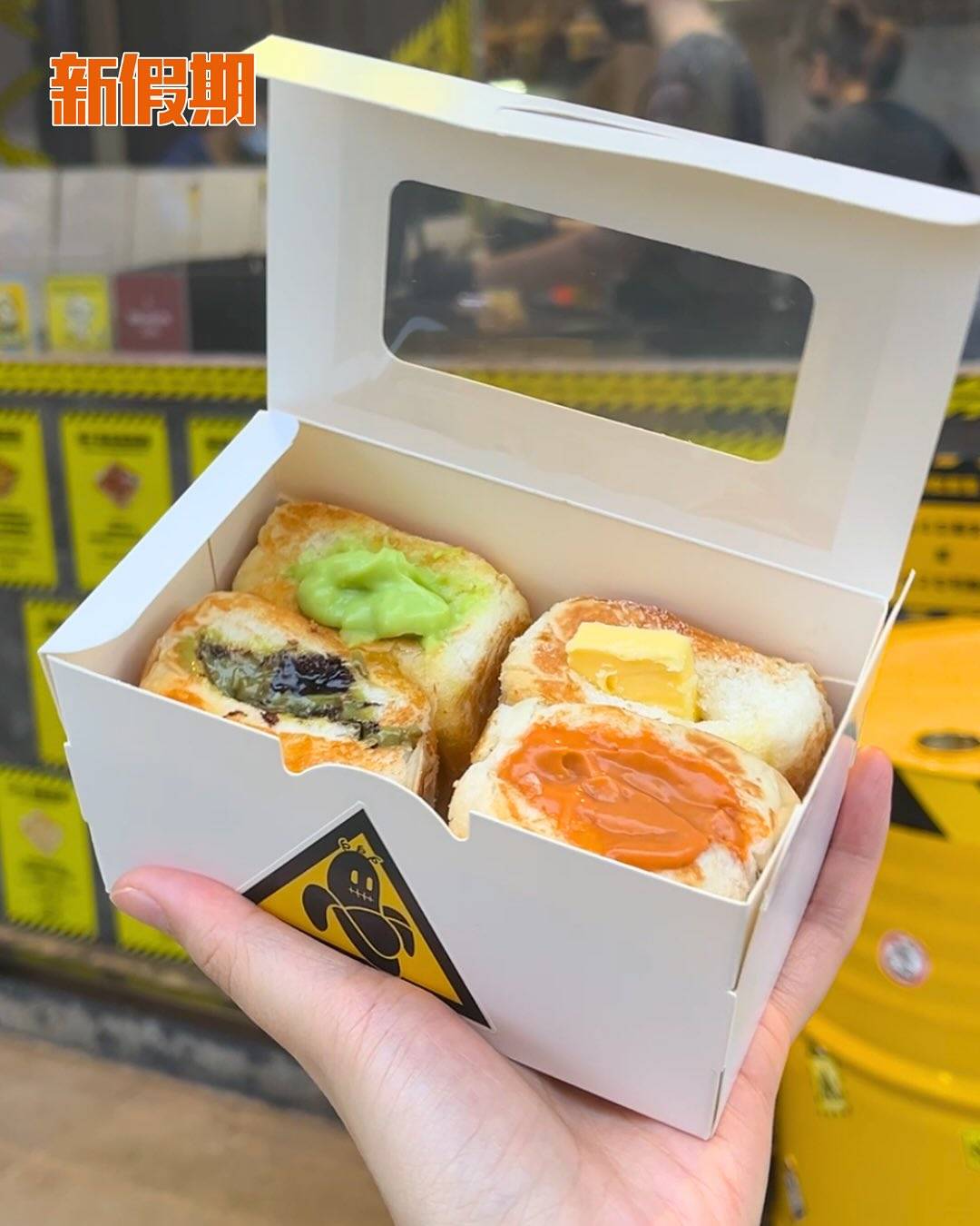 烤麵包選用牛油餐包仔,四面烤到金黃微脆,再加入自家製忌廉醬,爆漿邪惡!現場提供6款口味($15-$18個),包括鮮油砂糖、海鹽牛奶、黑朱古力、椰香班蘭、泰式奶茶、杜拜開心果朱古力,有經典亦有充滿東南亞風味,總有一款啱你心水。