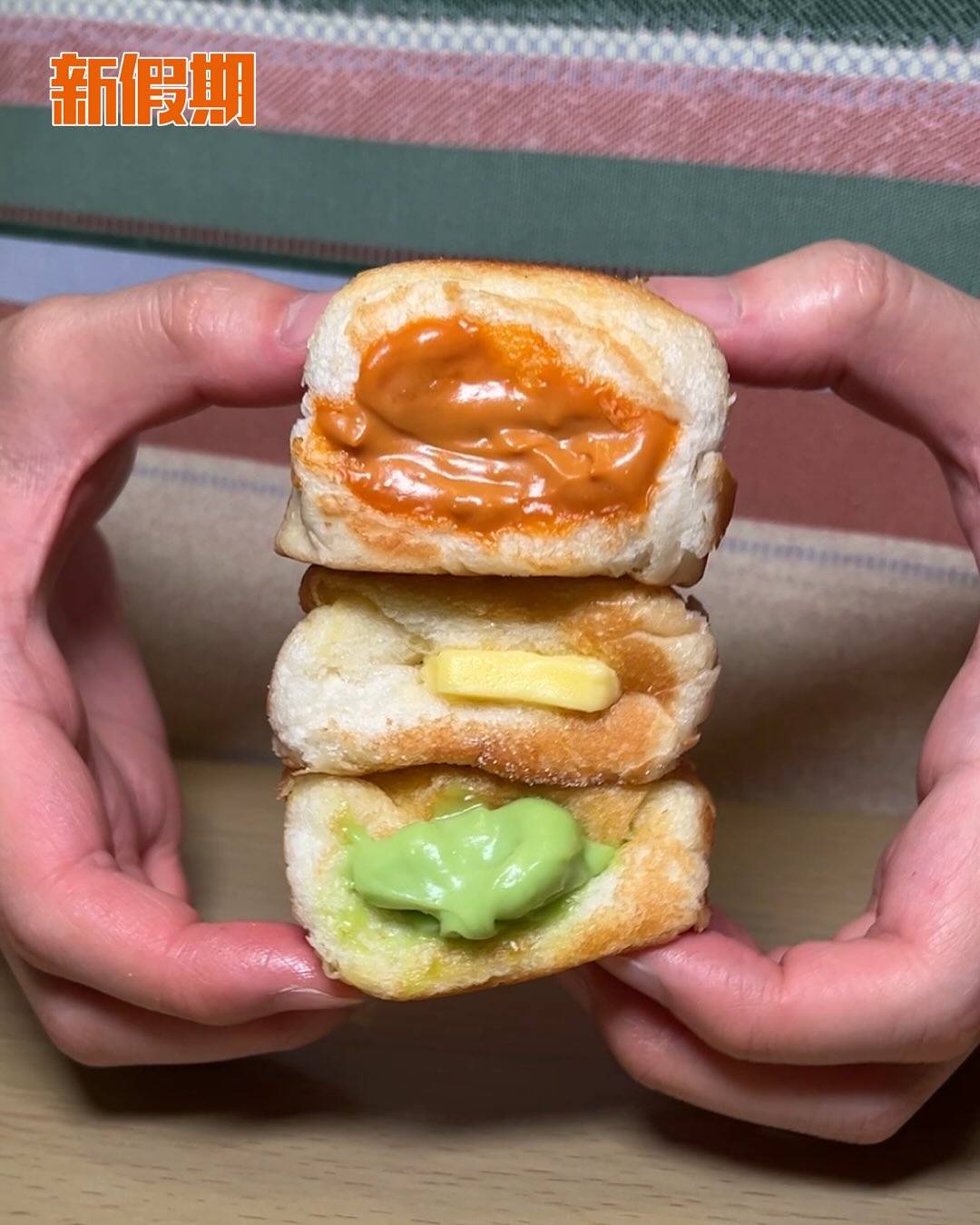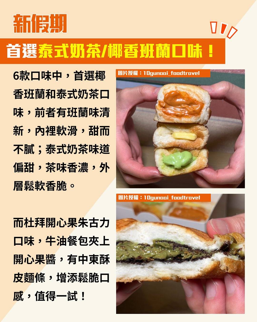 6款口味中,首選椰香班蘭和泰式奶茶口味,前者有班蘭味清新,內裡軟滑,甜而不膩;泰式奶茶味道偏甜,茶味香濃,外層鬆軟香脆。而杜拜開心果朱古力口味,牛油餐包夾上開心果醬,有中東酥皮麵條,增添鬆脆口感,值得一試!