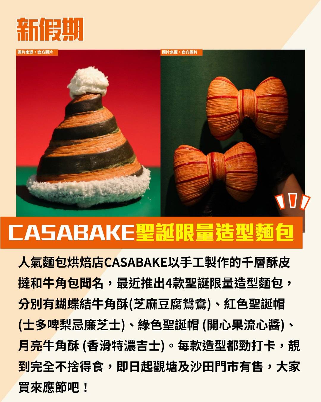 人氣麵包烘焙店CASABAKE以手工製作的千層酥皮撻和牛角包聞名,最近推出4款聖誕限量造型麵包,分別有蝴蝶結牛角酥(芝麻豆腐鴛鴦)、紅色聖誕帽(士多啤梨忌廉芝士)、綠色聖誕帽 (開心果流心醬)、月亮牛角酥 (香滑特濃吉士)。每款造型都勁打卡,靚到完全不捨得食,即日起觀塘及沙田門市有售,大家買來應節吧!