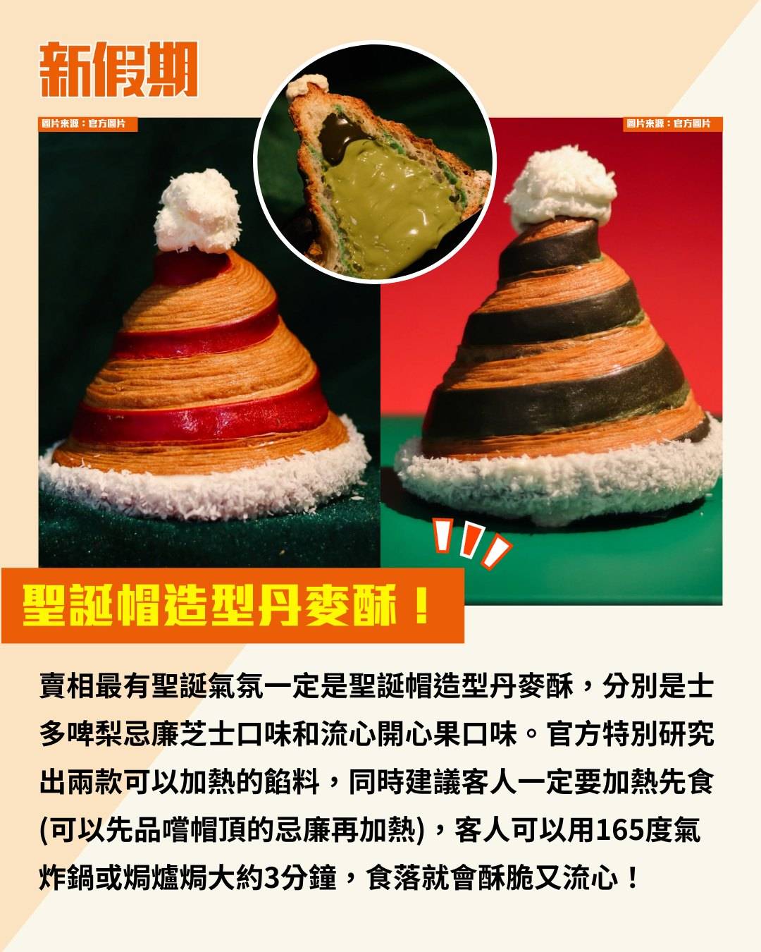 人氣麵包烘焙店CASABAKE推出4款聖誕限量造型麵包,賣相最有聖誕氣氛一定是聖誕帽造型丹麥酥,分別是士多啤梨忌廉芝士口味和流心開心果口味。官方特別研究出兩款可以加熱的餡料,同時建議客人一定要加熱先食(可以先品嚐帽頂的忌廉再加熱),客人可以用165度氣炸鍋或焗爐焗大約3分鐘,食落就會酥脆又流心!