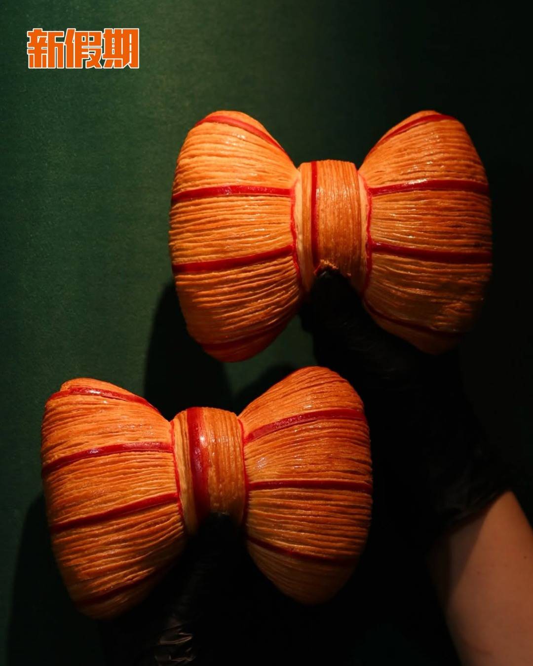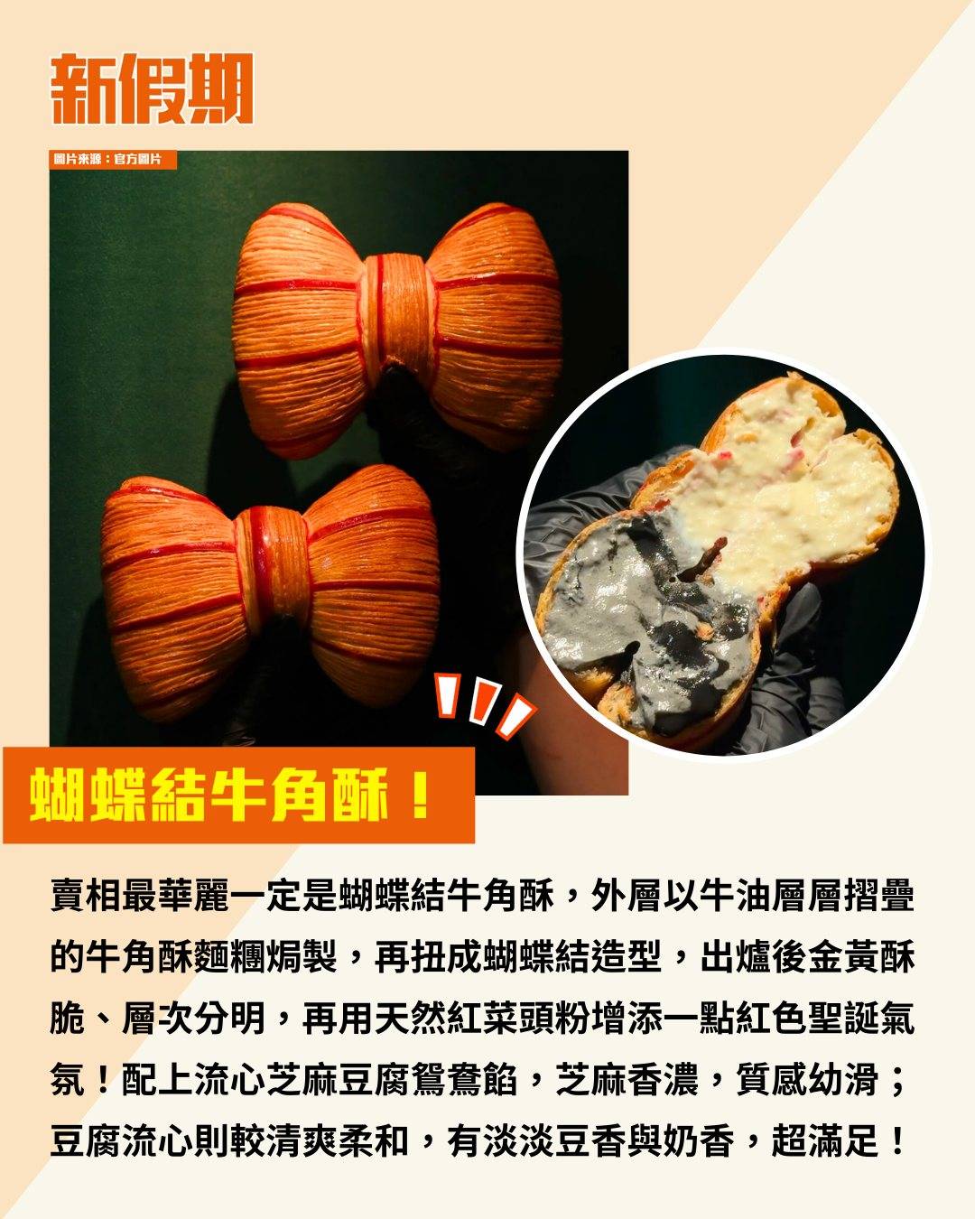 賣相最華麗一定是蝴蝶結牛角酥,外層以牛油層層摺疊的牛角酥麵糰焗製,再扭成蝴蝶結造型,出爐後金黃酥脆、層次分明,再用天然紅菜頭粉增添一點紅色聖誕氣氛!配上流心芝麻豆腐鴛鴦餡,芝麻香濃,質感幼滑;豆腐流心則較清爽柔和,有淡淡豆香與奶香,超滿足!