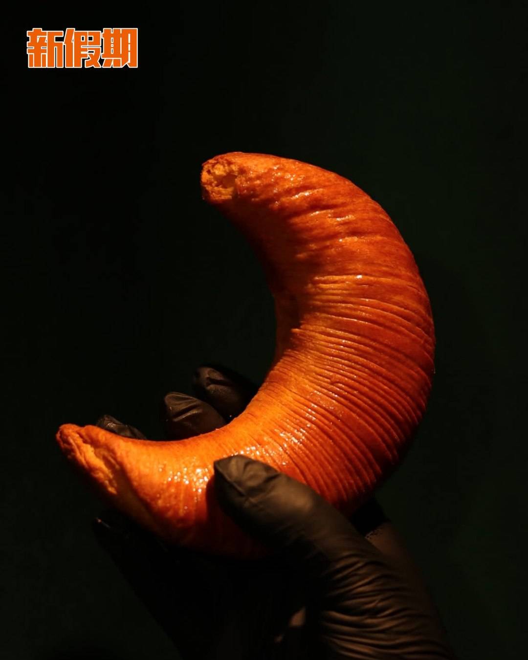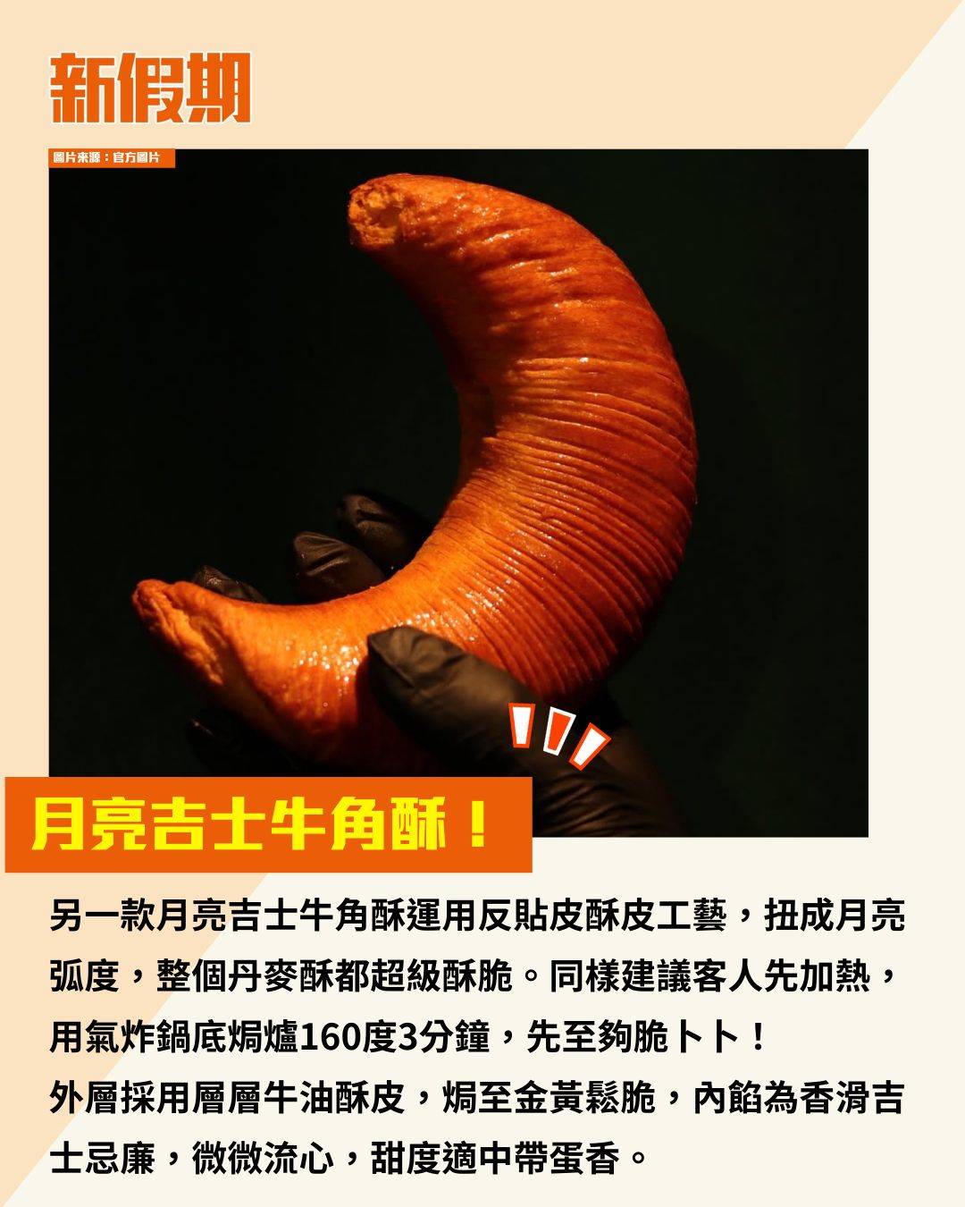 另一款月亮吉士牛角酥運用反貼皮酥皮工藝,扭成月亮弧度,整個丹麥酥都超級酥脆。同樣建議客人先加熱,用氣炸鍋底焗爐160度3分鐘,先至夠脆卜卜!外層採用層層牛油酥皮,焗至金黃鬆脆,內餡為香滑吉士忌廉,微微流心,甜度適中帶蛋香。